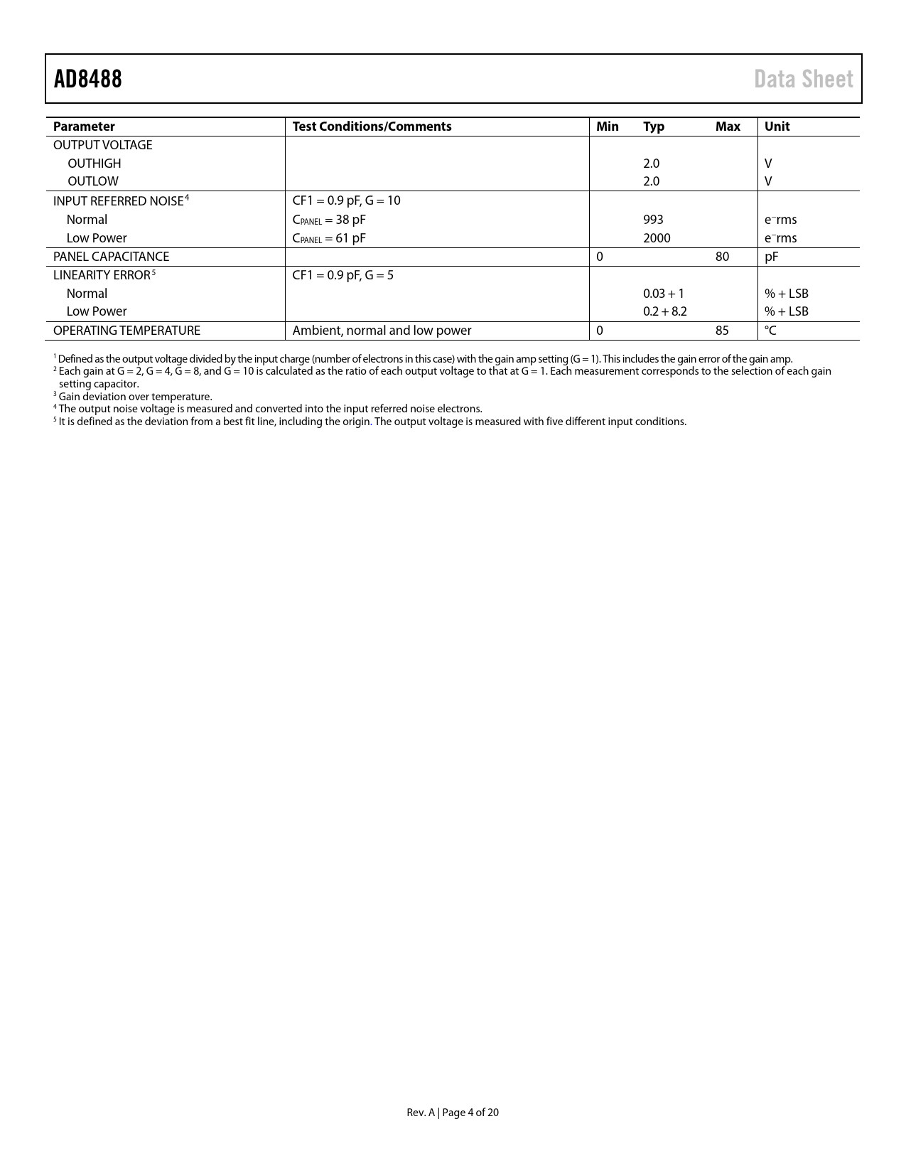 Páginas / Página20 / 4 — AD8488. Data Sheet. Parameter. Test Conditions/Comments. Min. Typ. Max. …