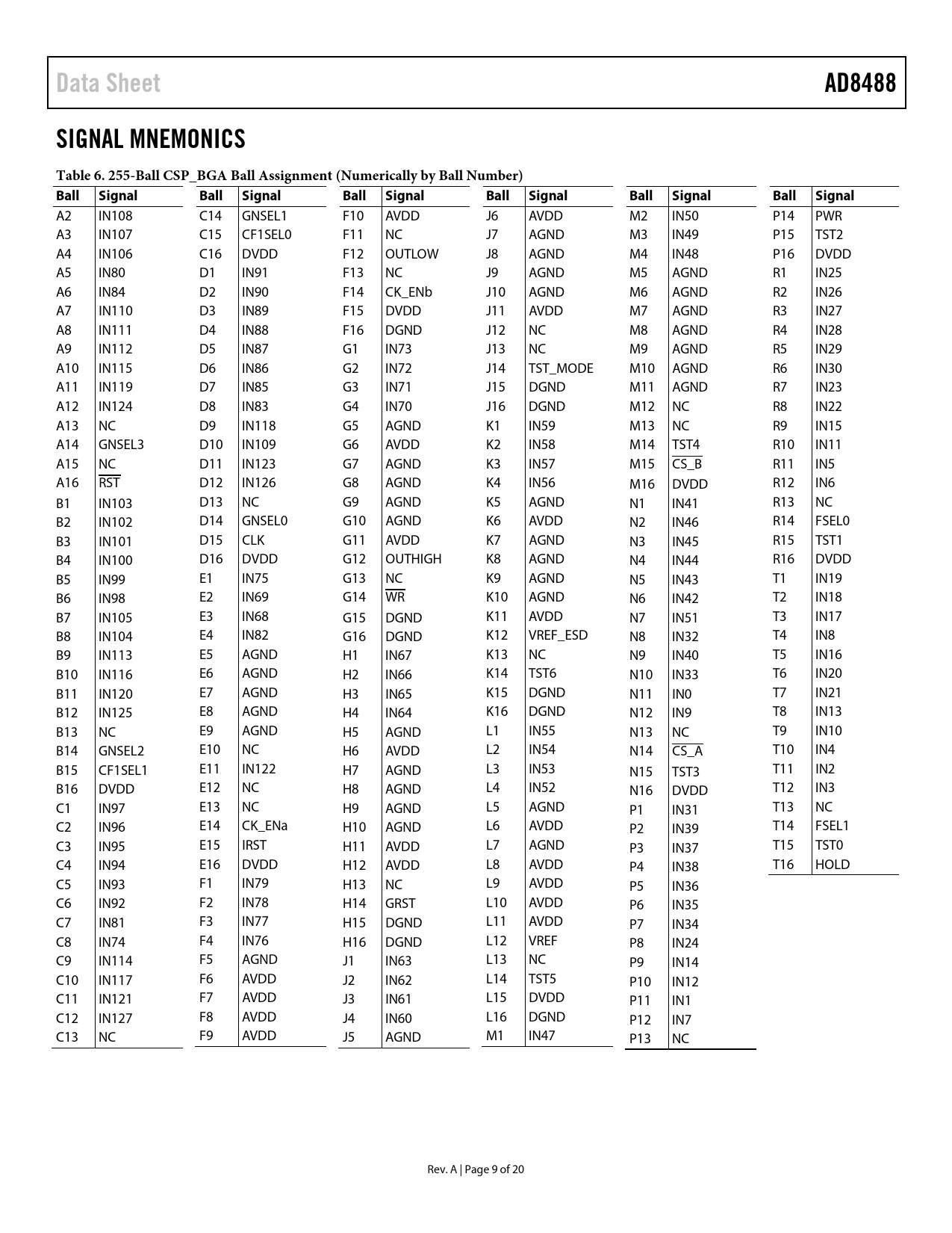 | Páginas / Página | 20 / 9 — Data Sheet. AD8488. SIGNAL MNEMONICS Table 6. 255-Ball CSP_BGA Ball … |