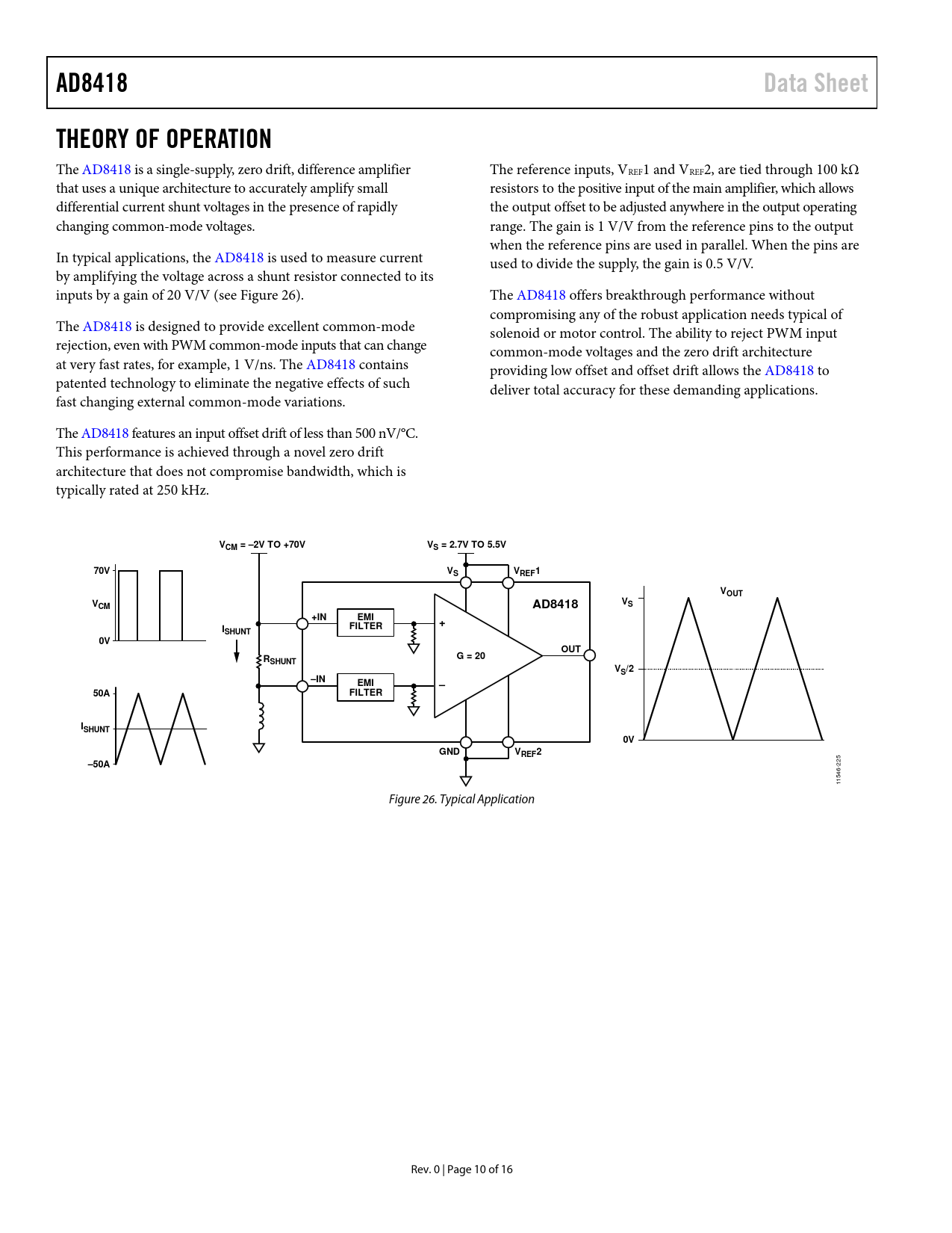 AD8418. Data Sheet. THEORY OF OPERATION. VCM = –2V TO +70V. VS = 2.7V TO 5.5V. 70V. REF1. VOUT. +IN. EMI. FILTER. SHUNT. OUT. G = 20. RSHUNT. VS/2. –IN