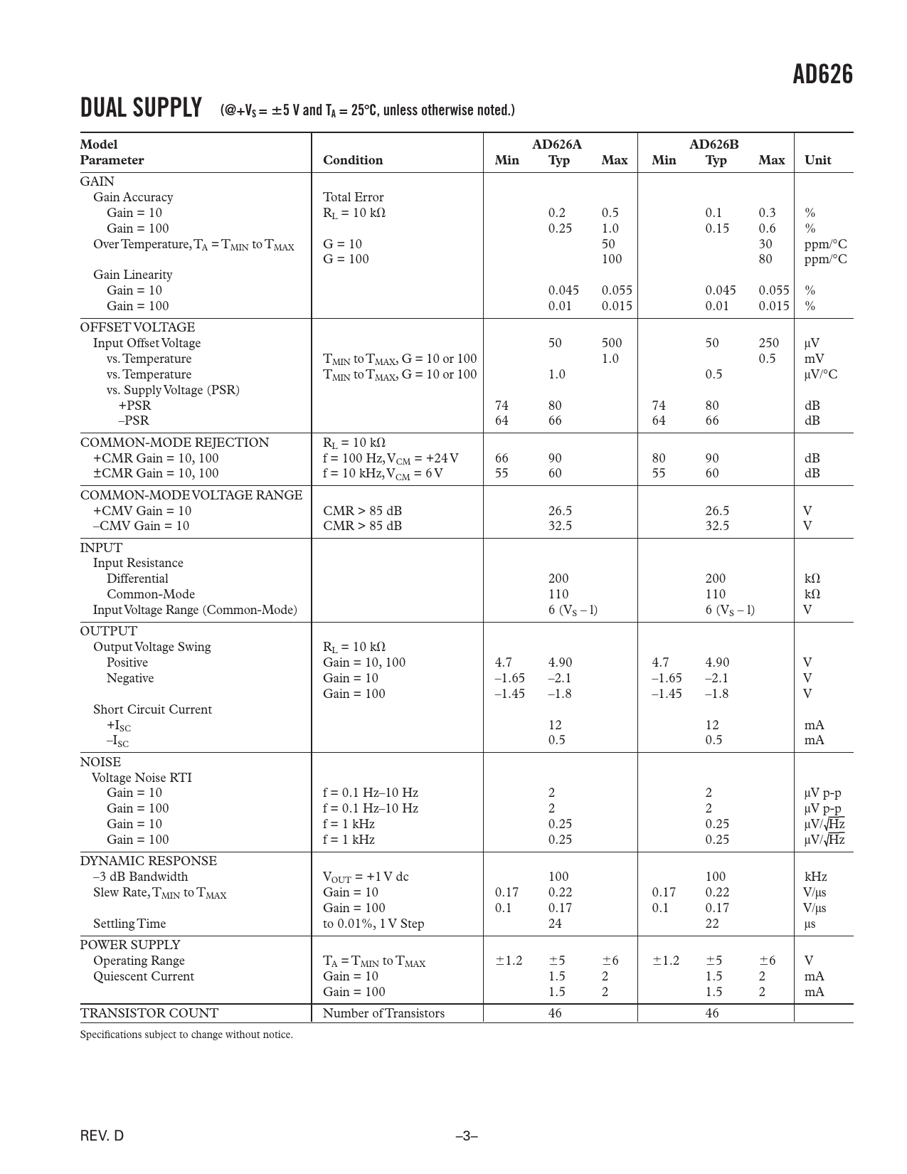 AD626DUAL SUPPLY (@+VS = ⴞ 5 V and TA = 25 ⴗ C, un less oth er wise noted.)Model AD626AAD626BParameter Condition Min TypMax Min TypMax Unit GAIN Gain Accuracy Total Error Gain = 10 RL = 10 k⍀ 0.2 0.5 0.1 0.3 % Gain = 100 0.25 1.0 0.15 0.6 % Over Temperature, TA = TMIN to TMAX G = 10 50 30 ppm/°C G = 100 100 80 ppm/°C Gain Linearity Gain = 10 0.045 0.055 0.045 0.055 % Gain = 100 0.01 0.015 0.01 0.015 % OFFSET VOLTAGE Input Offset Voltage 50 500 50 250 µV vs. Temperature TMIN to TMAX, G = 10 or 100 1.0 0.5 mV vs. Temperature TMIN to TMAX, G = 10 or 100 1.0 0.5 µV/°C vs. Supply Voltage (PSR) +PSR 74 80 74 80 dB –PSR 64 66 64 66 dB COMMON-MODE REJECTION RL = 10 k⍀ +CMR Gain = 10, 100 f = 100 Hz, VCM = +24 V 66 90 80 90 dB ±CMR Gain = 10, 100 f = 10 kHz, VCM = 6 V 55 60 55 60 dB COMMON-MODE VOLTAGE RANGE +CMV Gain = 10 CMR > 85 dB 26.5 26.5 V –CMV Gain = 10 CMR > 85 dB 32.5 32.5 V INPUT Input Resistance Differential 200 200 k⍀ Common-Mode 110 110 k⍀ Input Voltage Range (Common-Mode) 6 (VS – l) 6 (VS – l) V OUTPUT Output Voltage Swing RL = 10 k⍀ Positive Gain = 10, 100 4.7 4.90 4.7 4.90 V Negative Gain = 10 –1.65 –2.1 –1.65 –2.1 V Gain = 100 –1.45 –1.8 –1.45 –1.8 V Short Circuit Current +ISC 12 12 mA –ISC 0.5 0.5 mA NOISE Voltage Noise RTI Gain = 10 f = 0.1 Hz–10 Hz 2 2 µV p-p Gain = 100 f = 0.1 Hz–10 Hz 2 2 µV p-p Gain = 10 f = 1 kHz 0.25 0.25 µV/冑Hz Gain = 100 f = 1 kHz 0.25 0.25 µV/冑Hz DYNAMIC RESPONSE –3 dB Bandwidth VOUT = +1 V dc 100 100 kHz Slew Rate, TMIN to TMAX Gain = 10 0.17 0.22 0.17 0.22 V/µs Gain = 100 0.1 0.17 0.1 0.17 V/µs Settling Time to 0.01%, 1 V Step 24 22 µs POWER SUPPLY Operating Range TA = TMIN to TMAX ⫾1.2 ⫾5 ⫾6 ⫾1.2 ⫾5 ⫾6 V Quiescent Current Gain = 10 1.5 2 1.5 2 mA Gain = 100 1.5 2 1.5 2 mA TRANSISTOR COUNT Number of Transistors 46 46 Specifi cations subject to change without notice. REV. D –3– Document Outline FEATURES APPLICATIONS PRODUCT DESCRIPTION CONECTION DIAGRAM SPECIFICATIONS SINGLE SUPPLY DUAL SUPPLY ABSOLUTE MAXIMUM RATINGS ORDERING GUIDE Typical Performance Characteristics THEORY OF OPERATION ADJUSTING THE GAIN OF THE AD626 SINGLE-POLE LOW-PASS FILTERING CURRENT SENSOR INTERFACE BRIDGE APPLICATION OUTLINE DIMENSIONS Revision History
