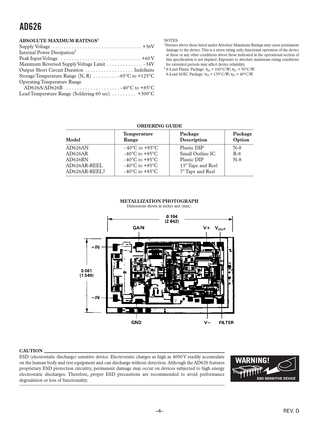 NOTES 1 Supply Voltage . +36 V Stresses above those listed under Absolute Max i mum Ratings may cause per ma nent damage to the device. This is a stress rating only; functional operation of the device Internal Power Dissipation2 at these or any other conditions above those indicated in the operational section of Peak Input Voltage . +60 V this specifi cation is not implied. Exposure to ab so lute maximum rating con di tions Maximum Reversed Supply Voltage Limit . –34 V for extended periods may affect device re li abil i ty. Output Short Circuit Duration . Indefi nite 2 8-Lead Plastic Package: ␪JA = 100°C/W; ␪JC = 50°C/W. Storage Temperature Range (N, R) . –65°C to +125°C 8-Lead SOIC Package: ␪JA = 155°C/W; ␪JC = 40°C/W. Operating Temperature Range AD626A/AD626B . – 40°C to +85°C Lead Temperature Range (Soldering 60 sec) . +300°C