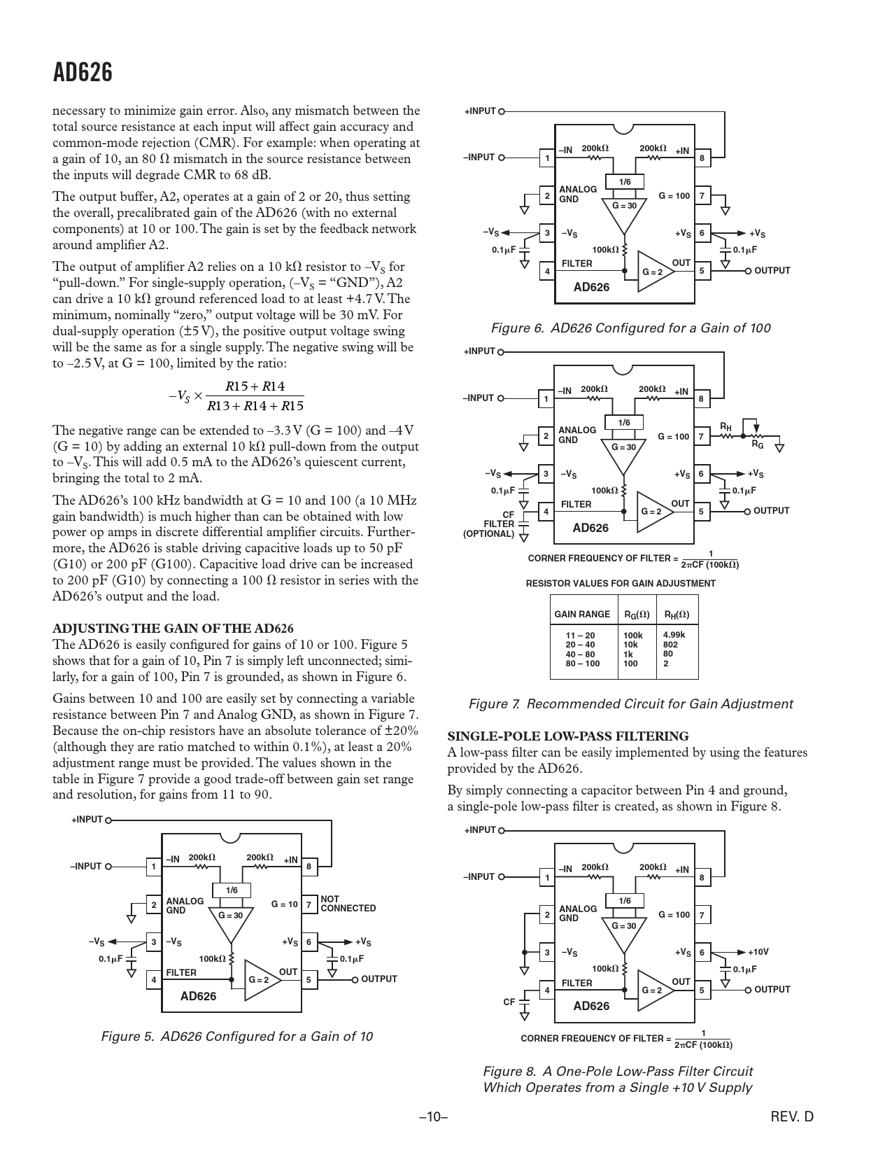 The AD626 is easily confi gured for gains of 10 or 100. Figure 5