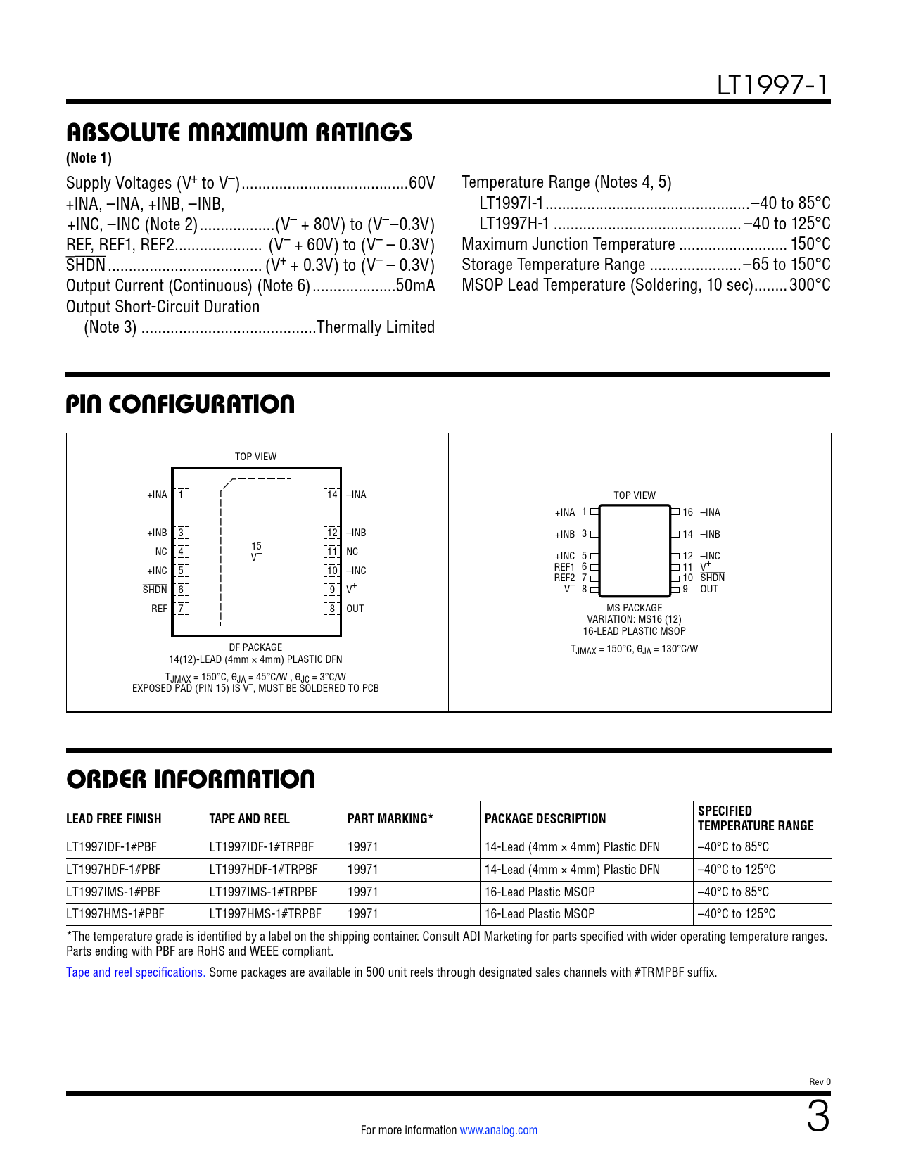 LT1997-1 ABSOLUTE MAXIMUM RATINGS (Note 1) Supply Voltages (V+ to V–) ..60V Temperature Range (Notes 4, 5) +INA, –INA, +INB, –INB, LT1997I-1 ...–40 to 85°C +INC, –INC (Note 2) ..(V– + 80V) to (V––0.3V) LT1997H-1 ... –40 to 125°C REF, REF1, REF2... (V– + 60V) to (V– – 0.3V) Maximum Junction Temperature .. 150°C SHDN ... (V+ + 0.3V) to (V– – 0.3V) Storage Temperature Range ..–65 to 150°C Output Current (Continuous) (Note 6) ..50mA MSOP Lead Temperature (Soldering, 10 sec) ..300°C Output Short-Circuit Duration (Note 3) ..Thermally Limited PIN CONFIGURATION TOP VIEW +INA 1 14 –INA TOP VIEW +INA 1 16 –INA +INB 3 12 –INB +INB 3 14 –INB NC 4 15 11 NC V– +INC 5 12 –INC +INC 5 10 –INC REF1 6 11 V+ REF2 7 10 SHDN SHDN 6 9 V+ V– 8 9 OUT REF 7 8 OUT MS PACKAGE VARIATION: MS16 (12) 16-LEAD PLASTIC MSOP DF PACKAGE TJMAX = 150°C, θJA = 130°C/W 14(12)-LEAD (4mm × 4mm) PLASTIC DFN TJMAX = 150°C, θJA = 45°C/W , θJC = 3°C/W EXPOSED PAD (PIN 15) IS V–, MUST BE SOLDERED TO PCB ORDER INFORMATIONLEAD FREE FINISHTAPE AND REELPART MARKING*PACKAGE DESCRIPTIONSPECIFIEDTEMPERATURE RANGE LT1997IDF-1#PBF LT1997IDF-1#TRPBF 19971 14-Lead (4mm × 4mm) Plastic DFN –40°C to 85°C LT1997HDF-1#PBF LT1997HDF-1#TRPBF 19971 14-Lead (4mm × 4mm) Plastic DFN –40°C to 125°C LT1997IMS-1#PBF LT1997IMS-1#TRPBF 19971 16-Lead Plastic MSOP –40°C to 85°C LT1997HMS-1#PBF LT1997HMS-1#TRPBF 19971 16-Lead Plastic MSOP –40°C to 125°C *The temperature grade is identified by a label on the shipping container. Consult ADI Marketing for parts specified with wider operating temperature ranges. Parts ending with PBF are RoHS and WEEE compliant. Tape and reel specifications. Some packages are available in 500 unit reels through designated sales channels with #TRMPBF suffix. Rev 0 For more information www.analog.com 3 Document Outline Features Applications Typical Application Description Absolute Maximum Ratings Pin Configuration Order Information Electrical Characteristics Typical Performance Characteristics Block Diagram Applications Information Package Description Typical Application Related Parts Features Applications Typical Application Description Absolute Maximum Ratings Pin Configuration Order Information Electrical Characteristics Typical Performance Characteristics Pin Functions Block Diagram Applications Information Package Description Typical Application Related Parts