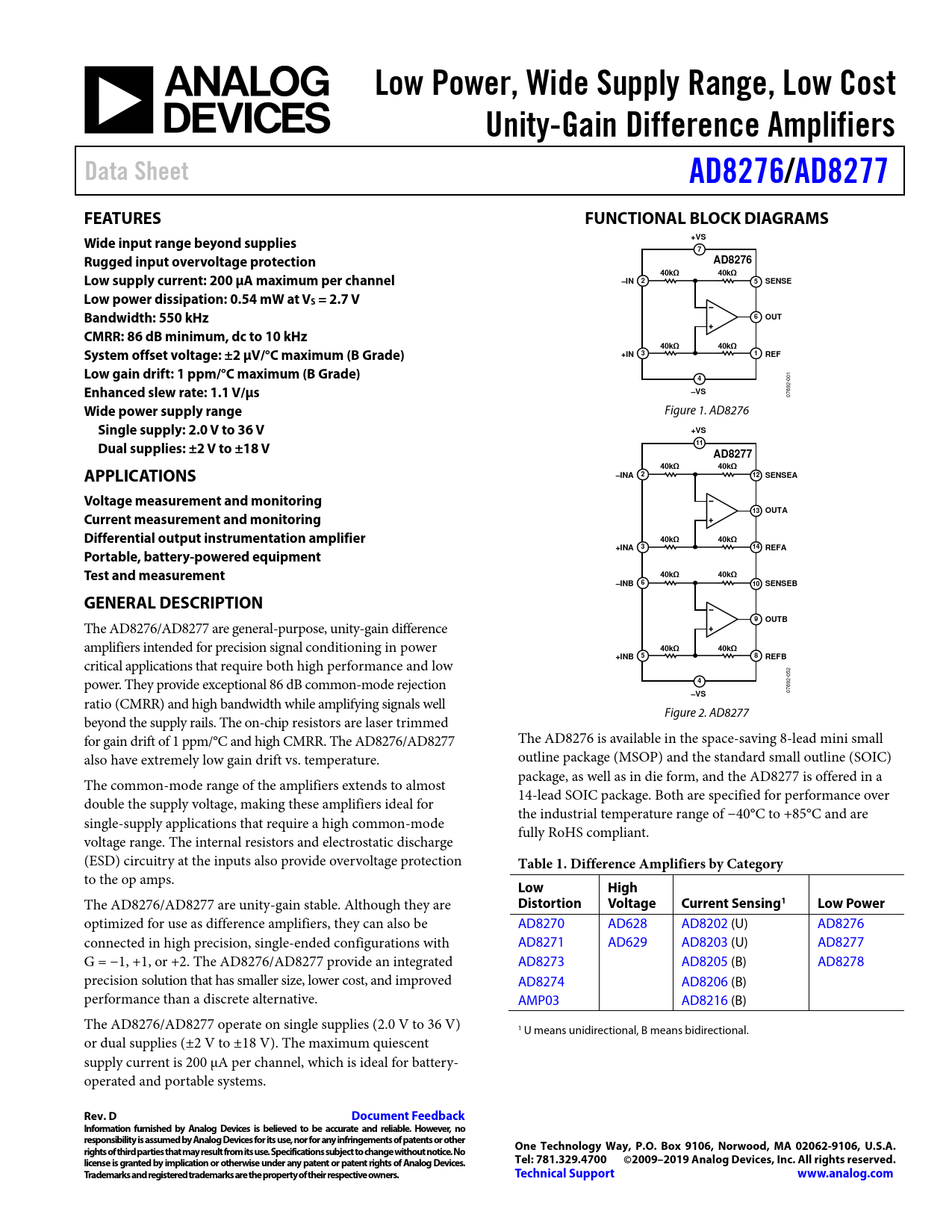Low Power, Wide Supply Range, Low Cost. Unity-Gain Difference Amplifiers. Data Sheet. AD8276/. AD8277. FEATURES