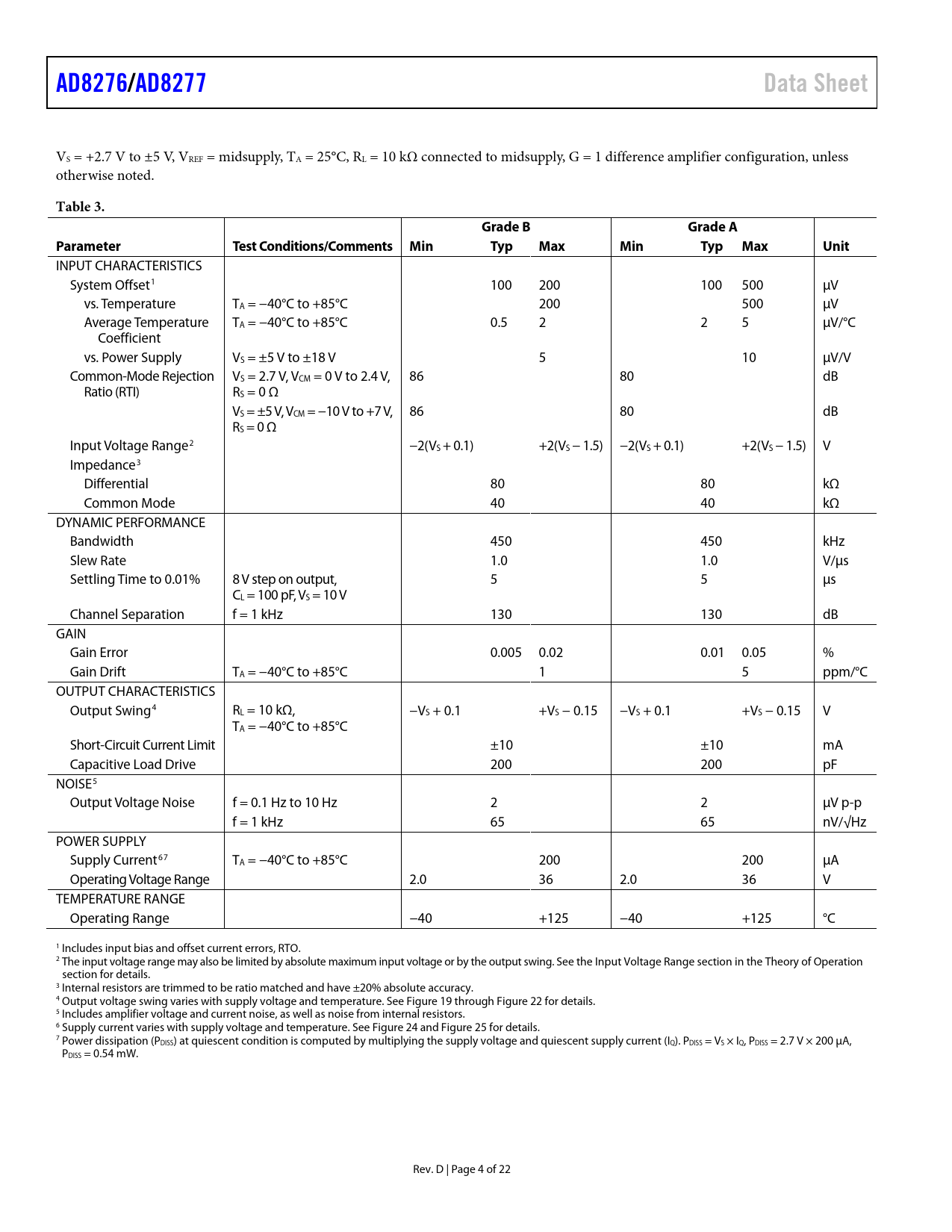 AD8276. /AD8277. Data Sheet. Table 3. Grade B. Grade A. Parameter. Test Conditions/Comments Min. Typ. Max. Min. Typ Max. Unit