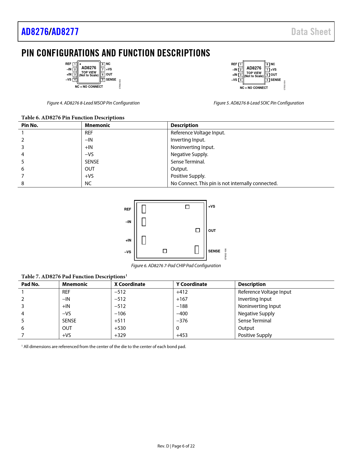 AD8276/AD8277Data SheetPIN CONFIGURATIONS AND FUNCTION DESCRIPTIONSREF18NCREF18NC–INAD8276AD827627+VS–IN27+VSTOP VIEW+INTOP VIEW36OUT(Not to Scale)+IN36OUT(Not to Scale)–VS45SENSE–VS45SENSE 003 004 NC = NO CONNECT 07692- NC = NO CONNECT 07692- Figure 4. AD8276 8-Lead MSOP Pin Configuration Figure 5. AD8276 8-Lead SOIC Pin Configuration Table 6. AD8276 Pin Function Descriptions Pin No.MnemonicDescription 1 REF Reference Voltage Input. 2 −IN Inverting Input. 3 +IN Noninverting Input. 4 −VS Negative Supply. 5 SENSE Sense Terminal. 6 OUT Output. 7 +VS Positive Supply. 8 NC No Connect. This pin is not internally connected. +VSREF–INOUT+INSENSE–VS 106 07692- Figure 6. AD8276 7-Pad CHIP Pad Configuration Table 7. AD8276 Pad Function Descriptions1 Pad No.MnemonicX CoordinateY CoordinateDescription 1 REF −512 +412 Reference Voltage Input 2 −IN −512 +167 Inverting Input 3 +IN −512 −188 Noninverting Input 4 −VS −106 −400 Negative Supply 5 SENSE +511 −376 Sense Terminal 6 OUT +530 0 Output 7 +VS +329 +453 Positive Supply 1 All dimensions are referenced from the center of the die to the center of each bond pad. Rev. D | Page 6 of 22 Document Outline Features Applications General Description Functional Block Diagrams Table of Contents Revision History Specifications Absolute Maximum Ratings Thermal Resistance Maximum Power Dissipation Short-Circuit Current ESD Caution Pin Configurations and Function Descriptions Typical Performance Characteristics Theory of Operation Circuit Information DC Performance AC Performance Driving the AD8276/AD8277 Input Voltage Range Power Supplies Applications Information Configurations Differential Output Current Source Voltage and Current Monitoring Instrumentation Amplifier RTD Die Information Die Specifications and Assembly Recommendations Outline Dimensions Ordering Guide