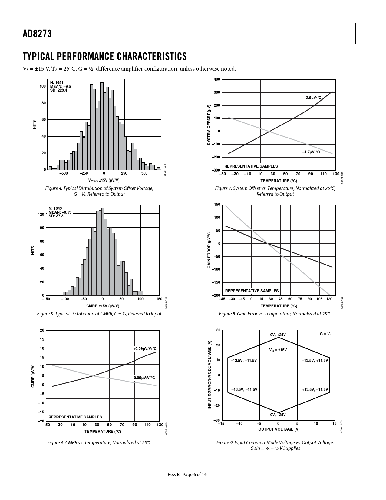AD8273TYPICAL PERFORMANCE CHARACTERISTICS VS = ±15 V, TA = 25°C, G = ½, difference amplifier configuration, unless otherwise noted. 400N: 1641100MEAN: –9.5 SD: 228.4300+2.9µV/°C80200μV) (60SET100SFTFHIO0EM40TSYS –10020–1.7µV/°C–200 36 0 REPRESENTATIVE SAMPLES 1- 0–300 98 –500–2500250500 30 –50–30–101030507090110130 06 -0 V 81 OSO ±15V (µV/V)TEMPERATURE (°C) 69 0 Figure 4. Typical Distribution of System Offset Voltage, Figure 7. System Offset vs. Temperature, Normalized at 25°C, G = ½, Referred to Output Referred to Output 150N: 1649 MEAN: –0.59120SD: 37.310010050V) V/80(µ0SRTO RHI60ER–50IN A40G –10020–150REPRESENTATIVE SAMPLES0–200 8 –150–100–50050100150 31 02 –45 –30–150153045607590105120 0 1- 1- 98 CMRR ±15V (µV/V) 98 TEMPERATURE (°C) 06 06 Figure 5. Typical Distribution of CMRR, G = ½, Referred to Input Figure 8. Gain Error vs. Temperature, Normalized at 25°C 20300V, +25VG = ½15) (V2010+0.09µV/V/°CE GVS = ±15VA15T L10–13.5V, +11.5V+13.5V, +11.5V) /V10E VOVDµO50–0.05µV/V/°C-MRR (N OCM0MM –10–13.5V, –11.5V+13.5V, –11.5V–5O C T–10PU –20IN–150V, –25VREPRESENTATIVE SAMPLES–20–30 3 29 –50–30–101030507090110130–15–10–5051015 05 -0 1- 81 OUTPUT VOLTAGE (V) 98 TEMPERATURE (°C) 69 06 0 Figure 6. CMRR vs. Temperature, Normalized at 25°C Figure 9. Input Common-Mode Voltage vs. Output Voltage, Gain = ½, ±15 V Supplies Rev. B | Page 6 of 16 Document Outline FEATURES APPLICATIONS FUNCTIONAL BLOCK DIAGRAM GENERAL DESCRIPTION TABLE OF CONTENTS REVISION HISTORY SPECIFICATIONS ABSOLUTE MAXIMUM RATINGS MAXIMUM POWER DISSIPATION ESD CAUTION PIN CONFIGURATION AND FUNCTION DESCRIPTIONS TYPICAL PERFORMANCE CHARACTERISTICS THEORY OF OPERATION CONFIGURATIONS POWER SUPPLIES OUTLINE DIMENSIONS ORDERING GUIDE
