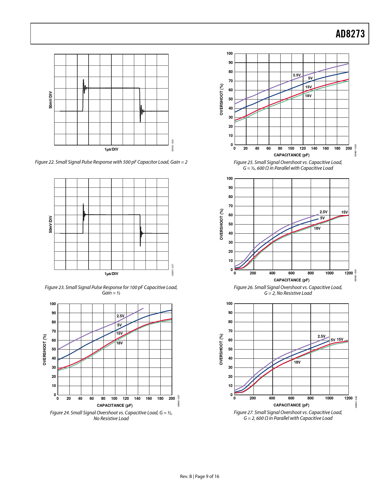 AD8273. 100. 2.5V. ) %. 15V. 18V. 50m. VER O. 1µs/DIV. 120. 140. 160. 180. 200. CAPACITANCE (pF). /D V. OOT (. H S. R E. 400. 600. 800. 1000. 1200. 5V 15V. T (. T O