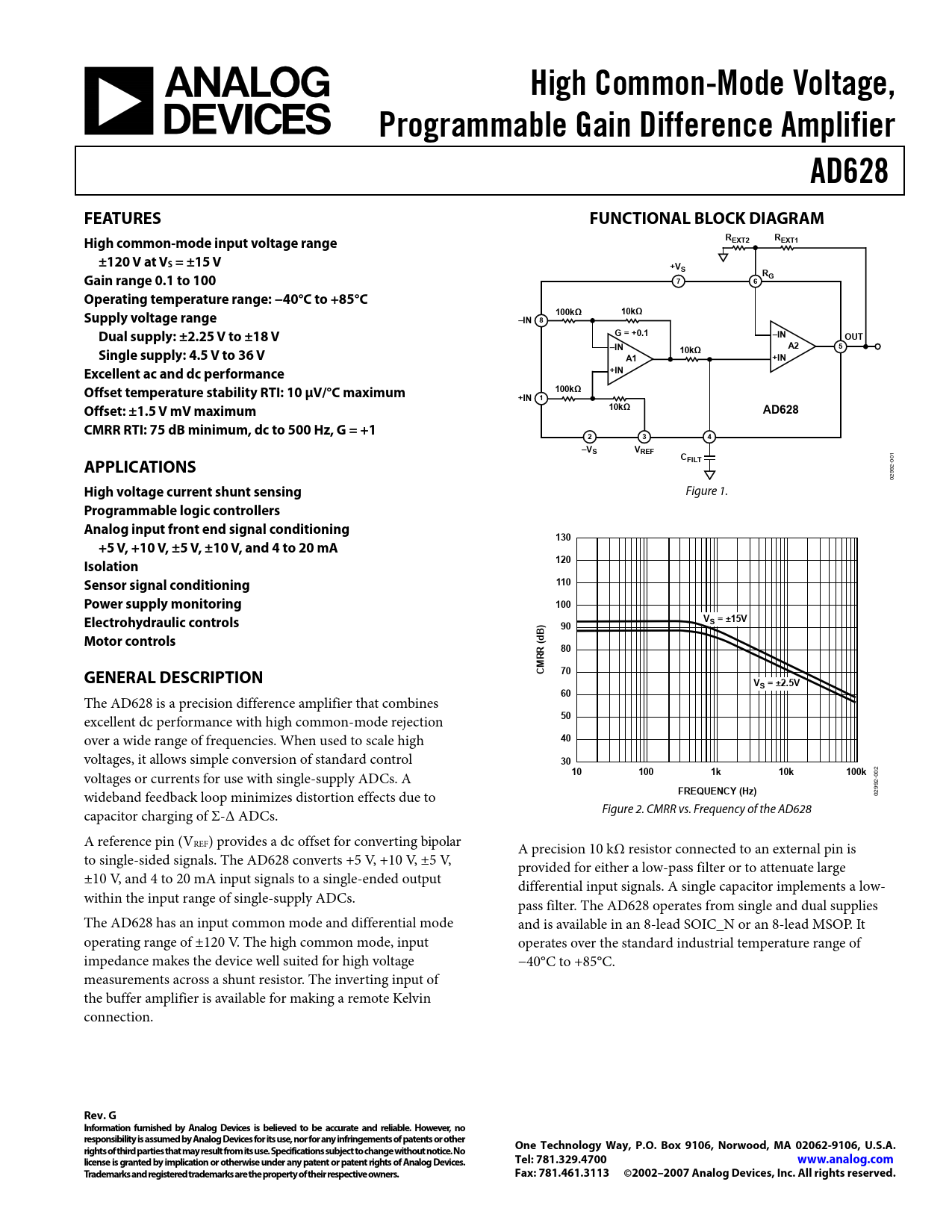 High Common-Mode Voltage,. Programmable Gain Difference Amplifier. AD628. FEATURES. FUNCTIONAL BLOCK DIAGRAM