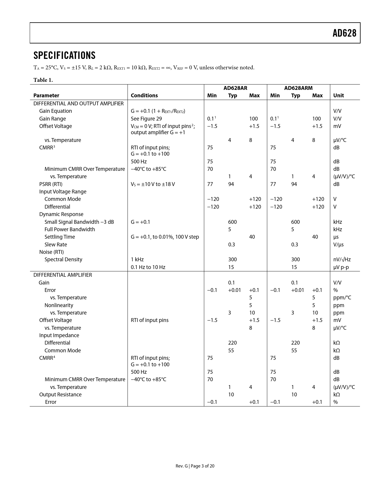AD628 SPECIFICATIONS Table 1 AD628AR AD628ARM Parameter Conditions Min Typ Max Unit