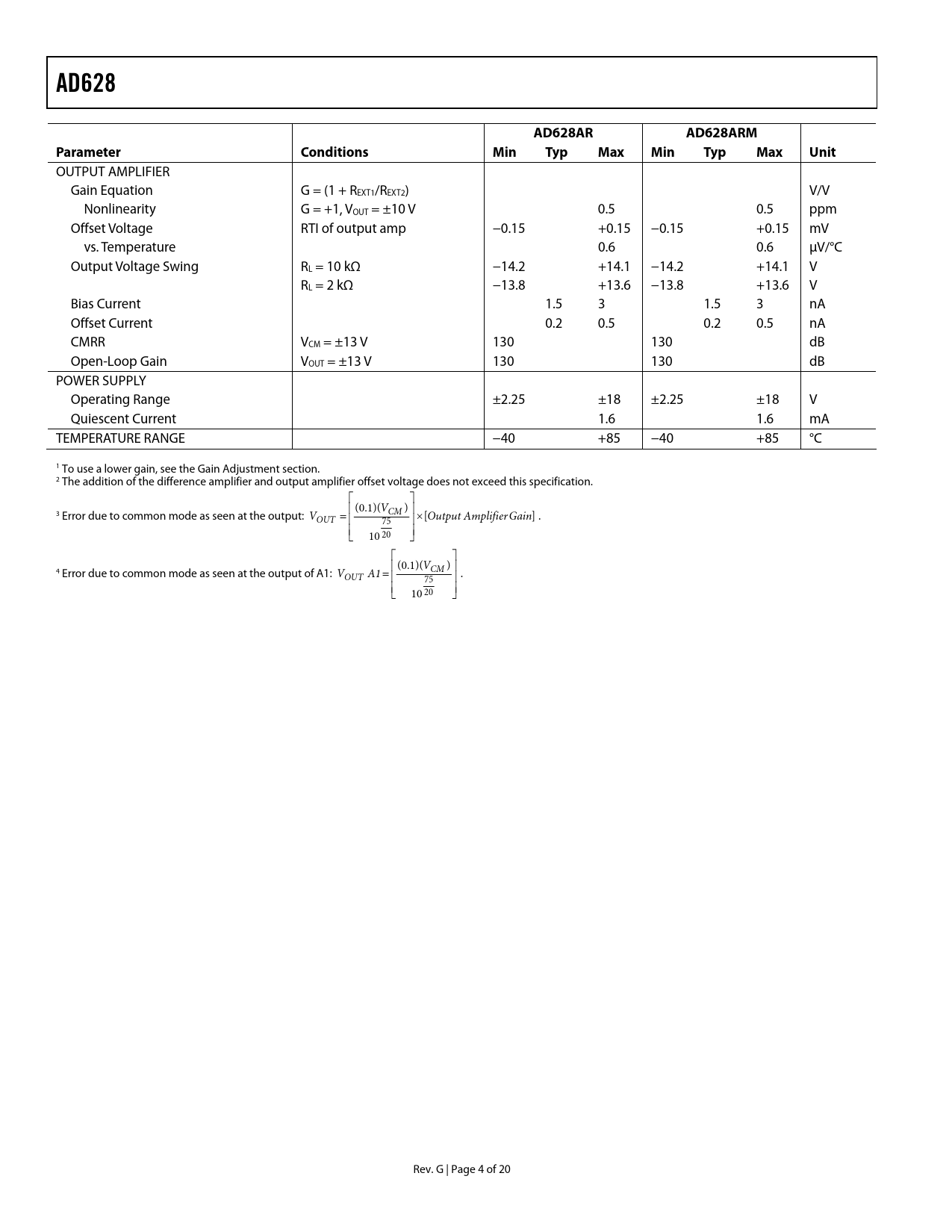 Páginas / Página20 / 4 — AD628. AD628AR. AD628ARM. Parameter. Conditions. Min. Typ. Max. Unit
