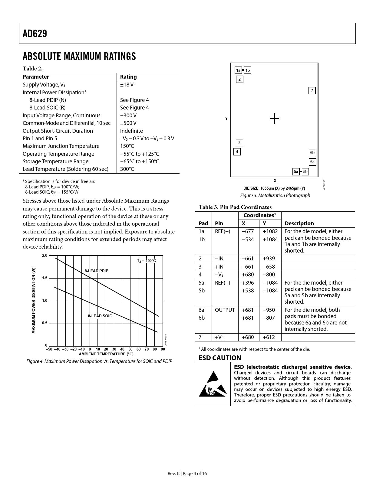 link to page 4 link to page 4 link to page 4 link to page 4 AD629ABSOLUTE MAXIMUM RATINGS Table 2.1a1bParameter Rating2 Supply Voltage, VS ±18 V Internal Power Dissipation1 7 8-Lead PDIP (N) See Figure 4 8-Lead SOIC (R) See Figure 4 Input Voltage Range, Continuous ±300 V Y Common-Mode and Differential, 10 sec ±500 V Output Short-Circuit Duration Indefinite Pin 1 and Pin 5 –VS − 0.3 V to +VS + 0.3 V 3 Maximum Junction Temperature 150°C Operating Temperature Range −55°C to +125°C 46b Storage Temperature Range −65°C to +150°C 6a Lead Temperature (Soldering 60 sec) 300°C 5a5b 1 Specification is for device in free air: X 41 0 3- 8-Lead PDIP, θJA = 100°C/W; DIE SIZE: 1655µm (X) by 2465µm (Y) 078 0 8-Lead SOIC, θJA = 155°C/W. Figure 5. Metallization Photograph Stresses above those listed under Absolute Maximum Ratings may cause permanent damage to the device. This is a stress Table 3. Pin Pad Coordinates rating only; functional operation of the device at these or any Coordinates1 other conditions above those indicated in the operational Pad PinXYDescription section of this specification is not implied. Exposure to absolute 1a REF(−) −677 +1082 For the die model, either maximum rating conditions for extended periods may affect 1b −534 +1084 pad can be bonded because device reliability. 1a and 1b are internally shorted. 2.0T 2 −IN −661 +939 J = 150°C) 3 +IN −661 −658 W8-LEAD PDIP( 4 −V 1.5 S +680 −800 TION 5a REF(+) +396 −1084 For the die model, either A P 5b +538 −1084 pad can be bonded because ISSI 5a and 5b are internally D R1.0E shorted. W 6a OUTPUT +681 −950 For the die model, both M PO8-LEAD SOIC 6b +681 −807 pads must be bonded MU0.5 because 6a and 6b are not XI internally shorted. MA 04 0 7 +VS +680 +612 3- 78 0 00 –50 –40 –30 –20 –10 010 20 30 40 50 60 70 80 90 1 All coordinates are with respect to the center of the die. AMBIENT TEMPERATURE (°C)ESD CAUTION Figure 4. Maximum Power Dissipation vs. Temperature for SOIC and PDIP Rev. C | Page 4 of 16 Document Outline FEATURES APPLICATIONS FUNCTIONAL BLOCK DIAGRAM GENERAL DESCRIPTION TABLE OF CONTENTS REVISION HISTORY SPECIFICATIONS ABSOLUTE MAXIMUM RATINGS ESD CAUTION PIN CONFIGURATION AND FUNCTION DESCRIPTIONS TYPICAL PERFORMANCE CHARACTERISTICS THEORY OF OPERATION APPLICATIONS BASIC CONNECTIONS SINGLE-SUPPLY OPERATION SYSTEM-LEVEL DECOUPLING AND GROUNDING USING A LARGE SENSE RESISTOR OUTPUT FILTERING OUTPUT CURRENT AND BUFFERING A GAIN OF 19 DIFFERENTIAL AMPLIFIER ERROR BUDGET ANALYSIS EXAMPLE 1 ERROR BUDGET ANALYSIS EXAMPLE 2 OUTLINE DIMENSIONS ORDERING GUIDE