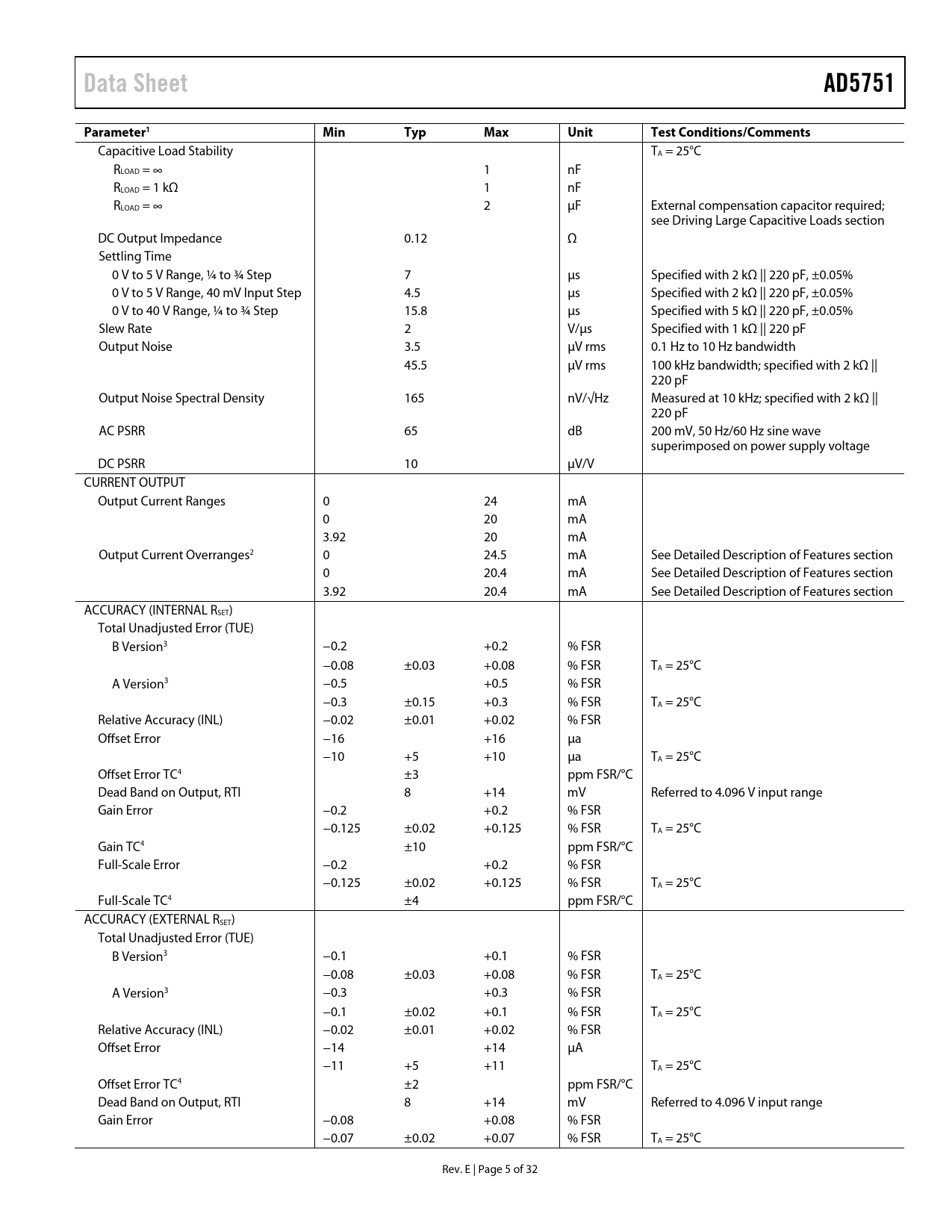 Páginas / Página32 / 5 — Data Sheet. AD5751. Parameter1. Min Typ Max Unit Test. Conditions/Comments