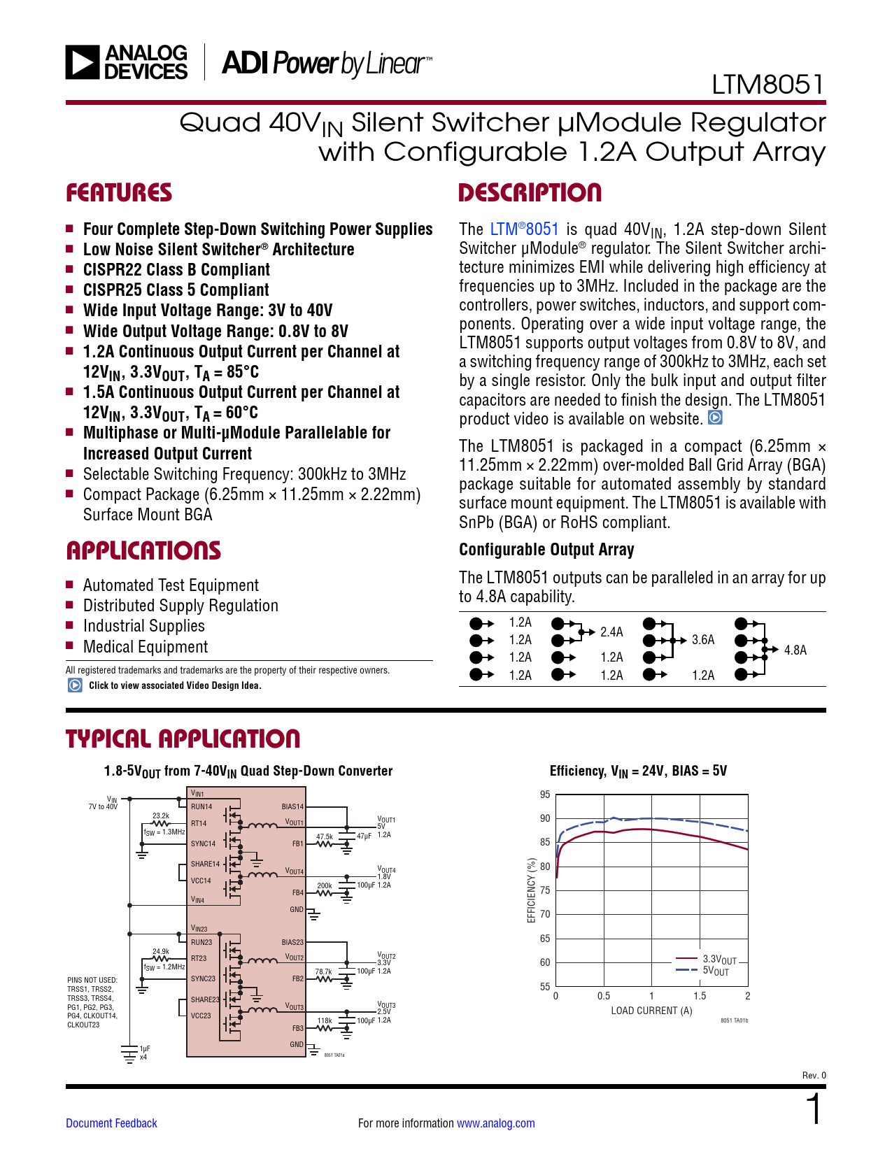 LTM8051 Quad 40VIN Silent Switcher μModule Regulator with Configurable 1.2A Output Array FEATURESDESCRIPTION n Four Complete Step-Down Switching Power Supplies The LTM®8051 is quad 40VIN, 1.2A step-down Silent n Low Noise Silent Switcher® Architecture Switcher μModule® regulator. The Silent Switcher archi- n CISPR22 Class B Compliant tecture minimizes EMI while delivering high efficiency at n frequencies up to 3MHz. Included in the package are the CISPR25 Class 5 Compliant n controllers, power switches, inductors, and support com- Wide Input Voltage Range: 3V to 40V n ponents. Operating over a wide input voltage range, the Wide Output Voltage Range: 0.8V to 8V LTM8051 supports output voltages from 0.8V to 8V, and n 1.2A Continuous Output Current per Channel at a switching frequency range of 300kHz to 3MHz, each set 12VIN, 3.3VOUT, TA = 85°C by a single resistor. Only the bulk input and output filter n 1.5A Continuous Output Current per Channel at capacitors are needed to finish the design. The LTM8051 12VIN, 3.3VOUT, TA = 60°C product video is available on website. n Multiphase or Multi-µModule Parallelable for The LTM8051 is packaged in a compact (6.25mm × Increased Output Current 11.25mm × 2.22mm) over-molded Ball Grid Array (BGA) n Selectable Switching Frequency: 300kHz to 3MHz package suitable for automated assembly by standard n Compact Package (6.25mm × 11.25mm × 2.22mm) surface mount equipment. The LTM8051 is available with Surface Mount BGA SnPb (BGA) or RoHS compliant. APPLICATIONSConfigurable Output Array n The LTM8051 outputs can be paralleled in an array for up Automated Test Equipment to 4.8A capability. n Distributed Supply Regulation n 1.2A Industrial Supplies 1.2A 2.4A 3.6A n Medical Equipment 1.2A 1.2A 4.8A All registered trademarks and trademarks are the property of their respective owners. 1.2A 1.2A 1.2A Click to view associated Video Design Idea.TYPICAL APPLICATION1.8-5VOUT from 7-40VIN Quad Step-Down ConverterEfficiency, VIN = 24V, BIAS = 5VEfficiency, VIN = 24V, BIAS = 5V VIN1 V 95 IN 7V to 40V RUN14 BIAS14 23.2k V 90 RT14 VOUT1 OUT1 5V fSW = 1.3MHz 47.5k 47µF 1.2A SYNC14 FB1 85 SHARE14 V 80 OUT4 VOUT4 1.8V VCC14 200k 100µF 1.2A FB4 75 VIN4 GND 70 EFFICIENCY (%) VIN23 RUN23 BIAS23 65 24.9k RT23 VOUT2 VOUT2 3.3V 60 OUT f 3.3V SW = 1.2MHz 78.7k 100µF 1.2A 5VOUT PINS NOT USED: SYNC23 FB2 TRSS1, TRSS2, 55 TRSS3, TRSS4, SHARE23 0 0.5 1 1.5 2 PG1, PG2, PG3, VOUT3 VOUT3 2.5V LOAD CURRENT (A) PG4, CLKOUT14, VCC23 118k 100µF 1.2A CLKOUT23 8051 TA01b FB3 1µF GND x4 8051 TA01a Rev. 0 Document Feedback For more information www.analog.com 1 Document Outline Features Applications Typical Application Description Absolute Maximum Ratings Pin Configuration Order Information Electrical Characteristics Typical Performance Characteristics Pin Functions Block Diagram Operation Applications Information Typical Applications Package Description Package Photo Design Resources Related Parts