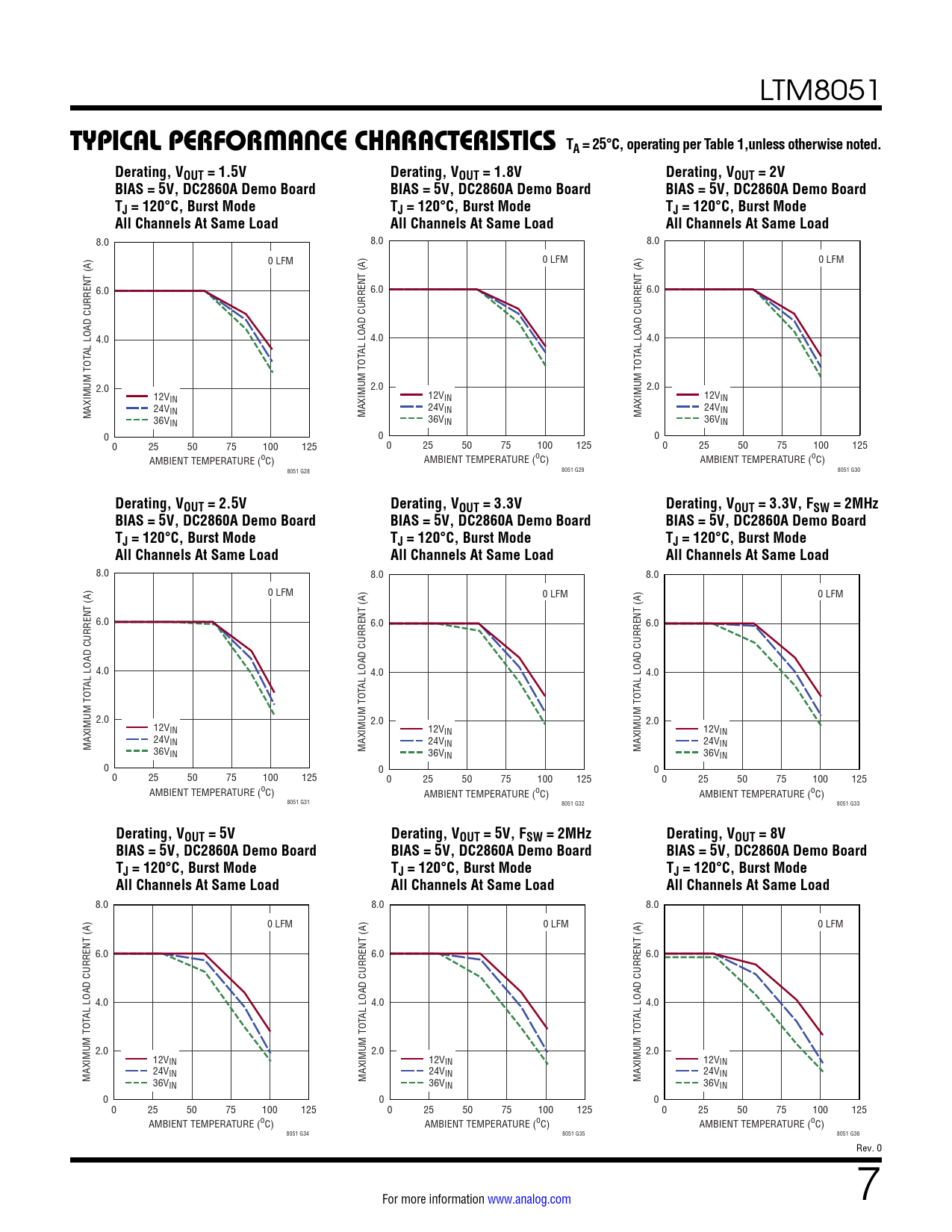 Derating, VOUT = 5V Derating, VOUT = 5V, FSW = 2MHz Derating, VOUT = 8V Derating, V Derating, V Derating, V BIAS = 5V, DC2860A Demo Board OUT = 5V BIAS = 5V, DC2860A Demo Board OUT = 5V, FSW = 2MHz BIAS = 5V, DC2860A Demo Board OUT = 8V BIAS = 5V, DC2860A Demo Bd BIAS = 5V, DC2860A Demo Bd BIAS = 5V, DC2860A Demo Bd TTJ = 120°C, Burst Mode TTJ = 120°C, Burst Mode TTJ = 120°C, Burst Mode All Channels At Same Load JMAX = 120oC, Burst Mode JMAX = 120oC, Burst Mode JMAX = 120oC, Burst Mode All Channels At Same Load All Channels At Same Load All Channels At Same Load All Channels At Same Load All Channels At Same Load