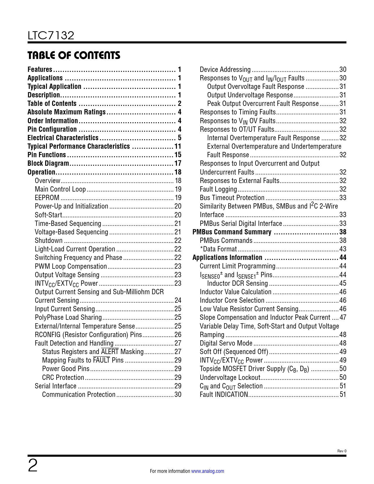PWM Loop Compensation ..23 Current Limit Programming ..44 Output Voltage Sensing ..23 I ± ± SENSE0 and ISENSE1 Pins ..44 INTVCC/EXTVCC Power ...23 Inductor DCR Sensing ..45 Output Current Sensing and Sub-Mil iohm DCR Inductor Value Calculation ..46 Current Sensing .. 24 Inductor Core Selection ..46 Input Current Sensing ...25 Low Value Resistor Current Sensing ...46 PolyPhase Load Sharing ...25 Slope Compensation and Inductor Peak Current ..47 External/Internal Temperature Sense ..25 Variable Delay Time, Soft-Start and Output Voltage RCONFIG (Resistor Configuration) Pins ..26 Ramping ...48 Fault Detection and Handling ..27 Digital Servo Mode ...48 Status Registers and ALERT Masking ...27 Soft Off (Sequenced Off) ..49 Mapping Faults to FAULT Pins ..29 INTVCC/EXTVCC Power ...49 Power Good Pins ..29 Topside MOSFET Driver Supply (CB, DB) ..50 CRC Protection ...29 Undervoltage Lockout ...50 Serial Interface ...29 CIN and COUT Selection ...51 Communication Protection ...30 Fault INDICATION .. 51 Rev 0 2 For more information www.analog.com Document Outline Features Applications Typical Application Description Table of Contents Absolute Maximum Ratings Order Information Pin Configuration Electrical Characteristics Typical Performance Characteristics Pin Functions Block Diagram Operation Overview Main Control Loop EEPROM Power-Up and Initialization Soft-Start Time-Based Sequencing Voltage-Based Sequencing Shutdown Light-Load Current Operation Switching Frequency and Phase PWM Loop Compensation Output Voltage Sensing INTVCC/EXTVCC Power Output Current Sensing and Sub-Milliohm DCR Current Sensing Input Current Sensing PolyPhase Load Sharing External/Internal Temperature Sense RCONFIG (Resistor Configuration) Pins Fault Detection and Handling Status Registers and ALERT Masking Mapping Faults to FAULT Pins Power Good Pins CRC Protection Serial Interface Communication Protection Device Addressing Responses to VOUT and IIN/IOUT Faults Output Overvoltage Fault Response Output Undervoltage Response Peak Output Overcurrent Fault Response Responses to Timing Faults Responses to VIN OV Faults Responses to OT/UT Faults Internal Overtemperature Fault Response External Overtemperature and Undertemperature Fault Response Responses to Input Overcurrent and Output Undercurrent Faults Responses to External Faults Fault Logging Bus Timeout Protection Similarity Between PMBus, SMBus and I2C 2-Wire Interface PMBus Serial Digital Interface PMBus Command Summary PMBus Commands *Data Format Applications Information Current Limit Programming ISENSE0± and ISENSE1± Pins Inductor DCR Sensing Inductor Value Calculation Inductor Core Selection Low Value Resistor Current Sensing Slope Compensation and Inductor Peak Current Variable Delay Time, Soft-Start and Output Voltage Ramping Digital Servo Mode Soft Off (Sequenced Off) INTVCC/EXTVCC Power Topside MOSFET Driver Supply (CB, DB) Undervoltage Lockout CIN and COUT Selection Fault INDICATION Open-Drain Pins Phase-Locked Loop and Frequency Synchronization Minimum On-Time Considerations External Temperature Sense Input Current Sense Amplifier External Resistor Configuration Pins (RCONFIG) Voltage Selection Frequency Selection Phase Selection Address Selection Using RCONFIG Efficiency Considerations Thermal Considerations Programmable Loop Compensation Checking Transient Response PolyPhase Configuration PC Board Layout Checklist PC Board Layout Debugging Design Example Additional Design Checks Connecting the USB to I2C/SMBus/PMBus Controller to the LTC7132 in System LTpowerPlay: An Interactive GUI for Digital Power PMBus Communication and Command Processing PMBus Command Details Addressing and Write Protect General Configuration Commands On/Off/Margin PWM Configuration Voltage Input Voltage and Limits Output Voltage and Limits Output Current and Limits Input Current and Limits Temperature External Temperature Calibration Timing Timing—On Sequence/Ramp Timing—Off Sequence/Ramp Precondition for Restart Fault Response Fault Responses All Faults Fault Responses Input Voltage Fault Responses Output Voltage Fault Responses Output Current Fault Responses IC Temperature Fault Responses External Temperature Fault Sharing Fault Sharing Propagation Fault Sharing Response Scratchpad Identification Fault Warning and Status Telemetry NVM Memory Commands Store/Restore Fault Logging Block Memory Write/Read Typical Applications Package Description Typical Application Related Parts