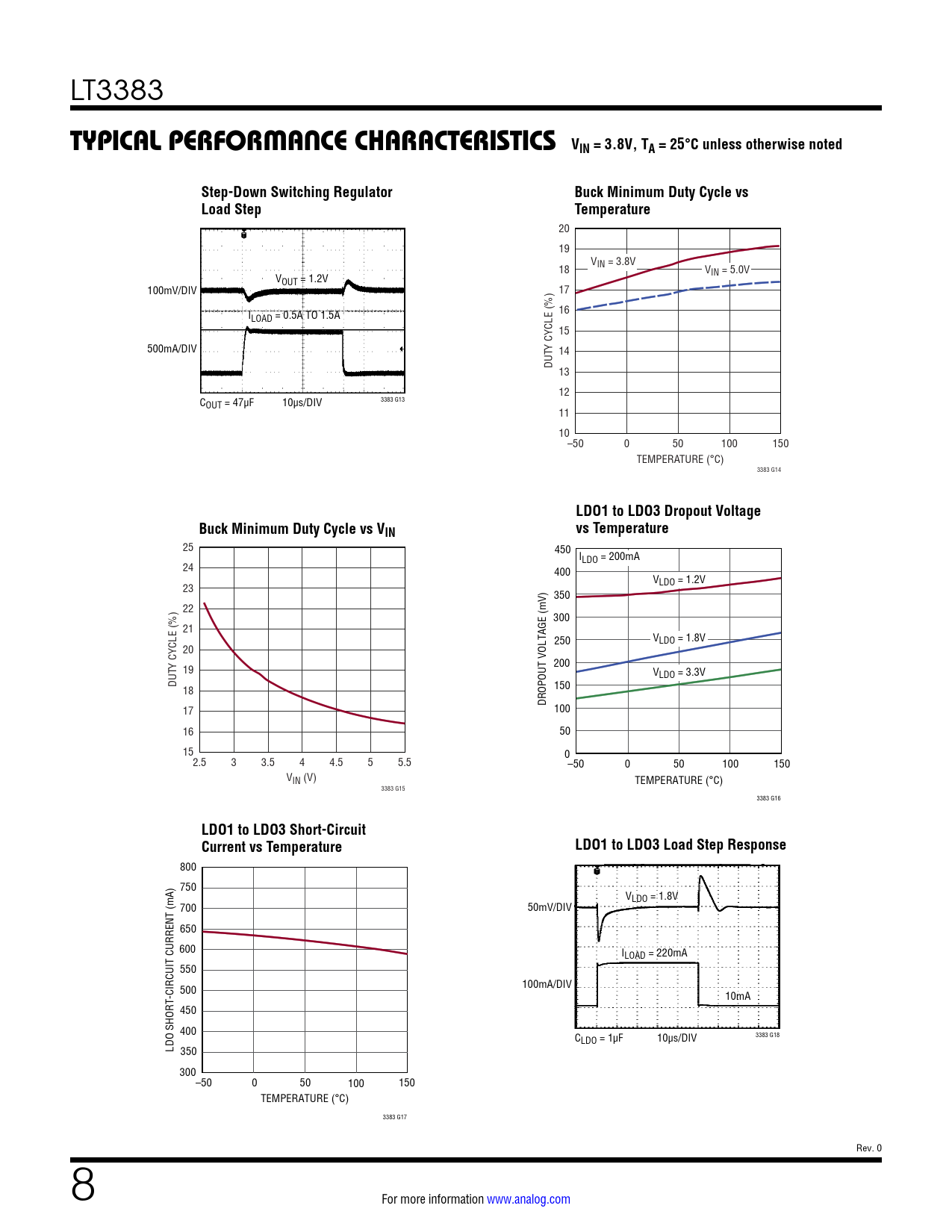 25 450 ILDO = 200mA 24 400 VLDO = 1.2V 23 350 22 300 21 250 VLDO = 1.8V 20 Y CYCLE (%) 200 19 VLDO = 3.3V DUT 150 18 DROPOUT VOLTAGE (mV) 17 100 16 50 15 0 2.5 3 3.5 4 4.5 5 5.5 –50 0 50 100 150 VIN (V) TEMPERATURE (°C) 3383 G15 3383 G16