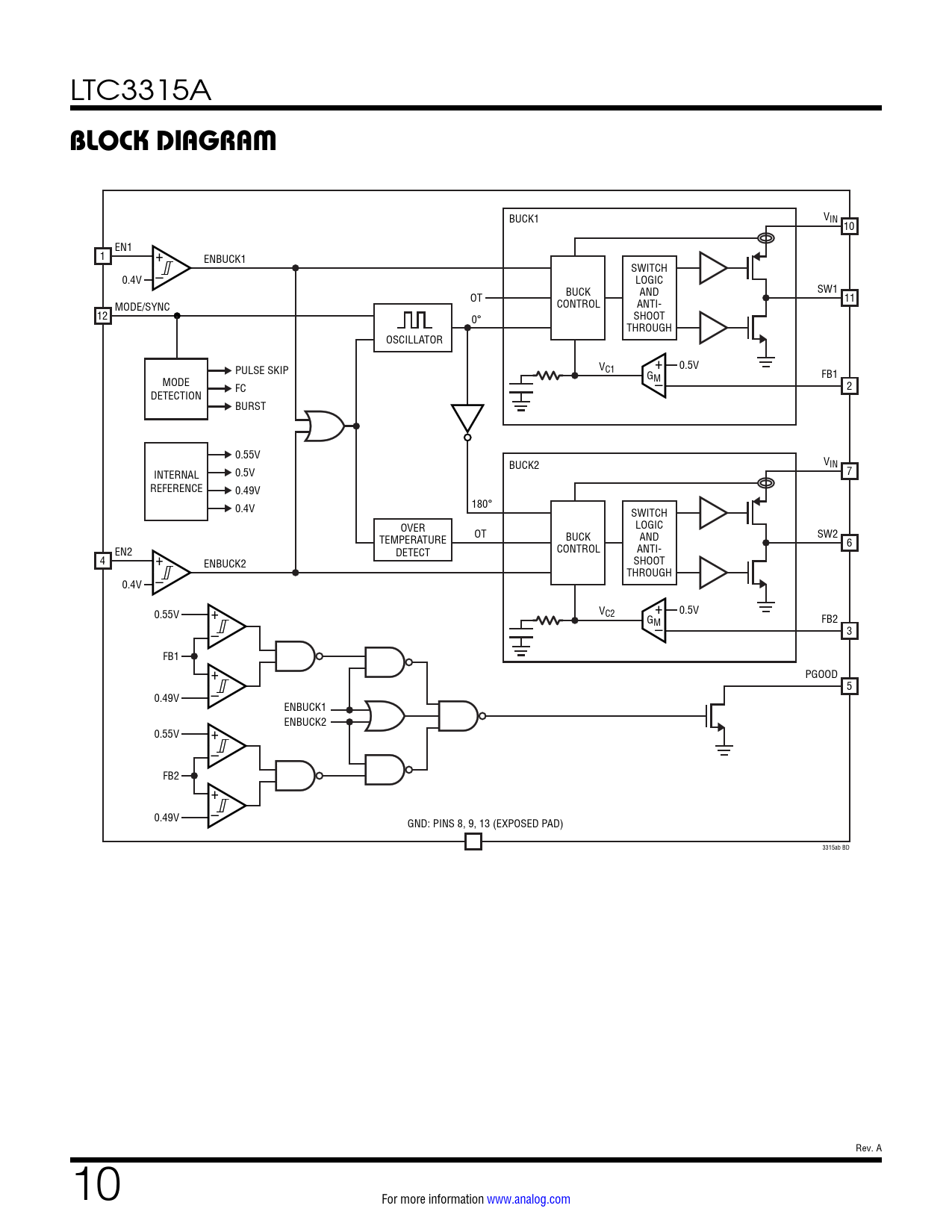 BUCK1 VIN 10 EN1 1 + ENBUCK1 SWITCH 0.4V – LOGIC SW1 BUCK AND OT 11 CONTROL ANTI- MODE/SYNC 12 SHOOT 0° THROUGH OSCILLATOR V + 0.5V PULSE SKIP C1 G FB1 M MODE FC – 2 DETECTION BURST 0.55V V BUCK2 IN 0.5V 7 INTERNAL REFERENCE 0.49V 0.4V 180° SWITCH LOGIC OVER OT SW2 BUCK AND TEMPERATURE 6 CONTROL ANTI- EN2 DETECT 4 + SHOOT ENBUCK2 THROUGH 0.4V – V + 0.5V 0.55V C2 + G FB2 M – 3 – FB1 + PGOOD 5 0.49V – ENBUCK1 ENBUCK2 0.55V + – FB2 + 0.49V – GND: PINS 8, 9, 13 (EXPOSED PAD) 3315ab BD Rev. A 10 For more information www.analog.com Document Outline Features Applications Typical Application Description Absolute Maximum Ratings Order Information Electrical Characteristics Pin Configuration Typical Performance Characteristics Pin Functions Block Diagram Operation Applications Information Typical Applications Package Description Revision History Typical Application Related Parts
