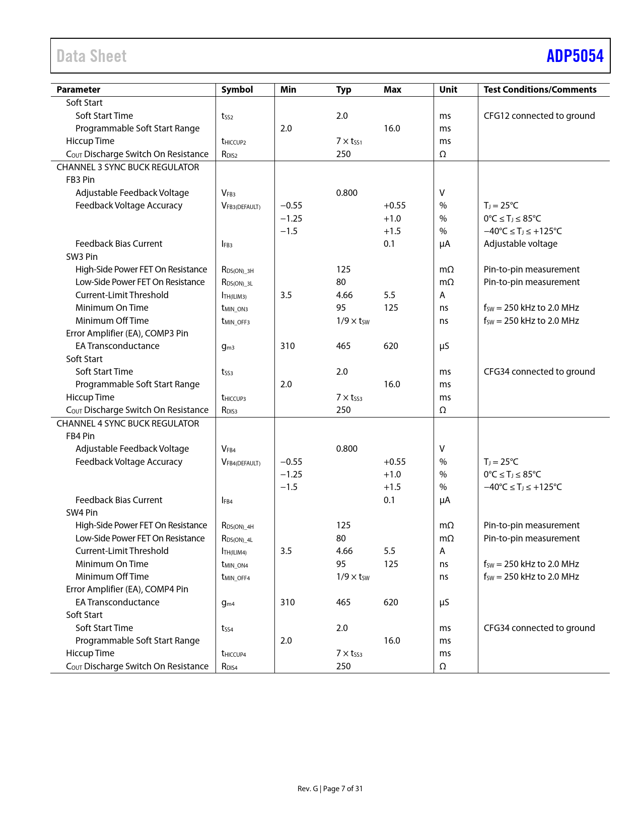 | Páginas / Página | 31 / 7 — Data Sheet. ADP5054. Parameter Symbol. Min. Typ. Max. Unit. Test. … |