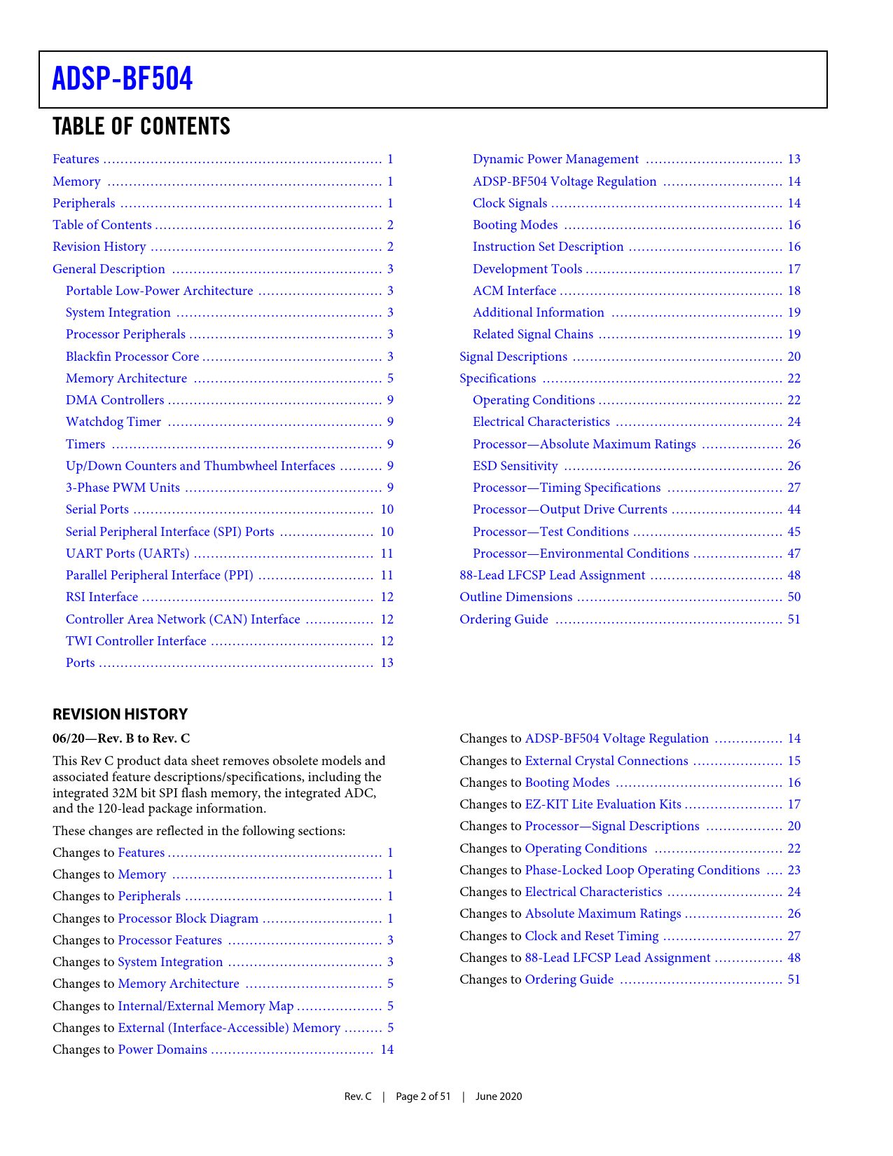link to page 1 link to page 1 link to page 1 link to page 2 link to page 2 link to page 3 link to page 3 link to page 3 link to page 3 link to page 3 link to page 5 link to page 9 link to page 9 link to page 9 link to page 9 link to page 9 link to page 10 link to page 10 link to page 11 link to page 11 link to page 12 link to page 12 link to page 12 link to page 13 link to page 13 link to page 14 link to page 14 link to page 16 link to page 16 link to page 17 link to page 18 link to page 19 link to page 19 link to page 20 link to page 22 link to page 22 link to page 24 link to page 26 link to page 26 link to page 27 link to page 44 link to page 45 link to page 47 link to page 48 link to page 50 link to page 51 link to page 23 link to page 1 link to page 26 link to page 27 link to page 14 link to page 1 link to page 1 link to page 1 link to page 3 link to page 3 link to page 5 link to page 5 link to page 5 link to page 14 link to page 15 link to page 16 link to page 17 link to page 20 link to page 22 link to page 24 link to page 48 link to page 51 ADSP-BF504TABLE OF CONTENTS Features ... 1 Dynamic Power Management .. 13 Memory .. 1 ADSP-BF504 Voltage Regulation .. 14 Peripherals ... 1 Clock Signals .. 14 Table of Contents ... 2 Booting Modes ... 16 Revision History .. 2 Instruction Set Description .. 16 General Description ... 3 Development Tools .. 17 Portable Low-Power Architecture ... 3 ACM Interface .. 18 System Integration .. 3 Additional Information .. 19 Processor Peripherals ... 3 Related Signal Chains ... 19 Blackfin Processor Core .. 3 Signal Descriptions ... 20 Memory Architecture .. 5 Specifications .. 22 DMA Controllers .. 9 Operating Conditions ... 22 Watchdog Timer .. 9 Electrical Characteristics ... 24 Timers ... 9 Processor—Absolute Maximum Ratings ... 26 Up/Down Counters and Thumbwheel Interfaces .. 9 ESD Sensitivity ... 26 3-Phase PWM Units .. 9 Processor—Timing Specifications ... 27 Serial Ports .. 10 Processor—Output Drive Currents .. 44 Serial Peripheral Interface (SPI) Ports .. 10 Processor—Test Conditions ... 45 UART Ports (UARTs) .. 11 Processor—Environmental Conditions ... 47 Parallel Peripheral Interface (PPI) ... 11 88-Lead LFCSP Lead Assignment ... 48 RSI Interface .. 12 Outline Dimensions .. 50 Controller Area Network (CAN) Interface .. 12 Ordering Guide ... 51 TWI Controller Interface .. 12 Ports .. 13 REVISION HISTORY06/20—Rev. B to Rev. C Changes to ADSP-BF504 Voltage Regulation .. 14 This Rev C product data sheet removes obsolete models and Changes to External Crystal Connections ... 15 associated feature descriptions/specifications, including the Changes to Booting Modes ... 16 integrated 32M bit SPI flash memory, the integrated ADC, and the 120-lead package information. Changes to EZ-KIT Lite Evaluation Kits ... 17 These changes are reflected in the following sections: Changes to Processor—Signal Descriptions .. 20 Changes to Features .. 1 Changes to Operating Conditions .. 22 Changes to Memory ... 1 Changes to Phase-Locked Loop Operating Conditions .. 23 Changes to Peripherals .. 1 Changes to Electrical Characteristics ... 24 Changes to Processor Block Diagram .. 1 Changes to Absolute Maximum Ratings ... 26 Changes to Processor Features .. 3 Changes to Clock and Reset Timing .. 27 Changes to System Integration .. 3 Changes to 88-Lead LFCSP Lead Assignment .. 48 Changes to Memory Architecture .. 5 Changes to Ordering Guide .. 51 Changes to Internal/External Memory Map .. 5 Changes to External (Interface-Accessible) Memory ... 5 Changes to Power Domains .. 14 Rev. C | Page 2 of 51 | June 2020 Document Outline Blackfin Embedded Processor Features Memory Peripherals Table of Contents Revision History General Description Portable Low-Power Architecture System Integration Processor Peripherals Blackfin Processor Core Memory Architecture Internal (Core-Accessible) Memory External (Interface-Accessible) Memory I/O Memory Space Booting Event Handling Core Event Controller (CEC) System Interrupt Controller (SIC) Event Control DMA Controllers Watchdog Timer Timers Up/Down Counters and Thumbwheel Interfaces 3-Phase PWM Units Serial Ports Serial Peripheral Interface (SPI) Ports UART Ports (UARTs) Parallel Peripheral Interface (PPI) General-Purpose Mode Descriptions ITU-R 656 Mode Descriptions RSI Interface Controller Area Network (CAN) Interface TWI Controller Interface Ports General-Purpose I/O (GPIO) Dynamic Power Management Full-On Operating Mode—Maximum Performance Active Operating Mode—Moderate Dynamic Power Savings Sleep Operating Mode—High Dynamic Power Savings Deep Sleep Operating Mode—Maximum Dynamic Power Savings Hibernate State—Maximum Static Power Savings Power Savings ADSP-BF504 Voltage Regulation Clock Signals Booting Modes Instruction Set Description Development Tools Integrated Development Environments (IDEs) EZ-KIT Lite Evaluation Board EZ-KIT Lite Evaluation Kits Software Add-Ins for CrossCore Embedded Studio Board Support Packages for Evaluation Hardware Middleware Packages Algorithmic Modules Designing an Emulator-Compatible DSP Board (Target) ACM Interface Additional Information Related Signal Chains Signal Descriptions Specifications Operating Conditions ADSP-BF504 Clock Related Operating Conditions Electrical Characteristics Total Power Dissipation Processor—Absolute Maximum Ratings ESD Sensitivity Processor—Timing Specifications Clock and Reset Timing Parallel Peripheral Interface Timing RSI Controller Timing Serial Ports Serial Peripheral Interface (SPI) Port—Master Timing Serial Peripheral Interface (SPI) Port—Slave Timing Universal Asynchronous Receiver-Transmitter (UART) Ports—Receive and Transmit Timing General-Purpose Port Timing Timer Cycle Timing Timer Clock Timing Up/Down Counter/Rotary Encoder Timing Pulse Width Modulator (PWM) Timing ADC Controller Module (ACM) Timing JTAG Test And Emulation Port Timing Processor—Output Drive Currents Processor—Test Conditions Output Enable Time Measurement Ou