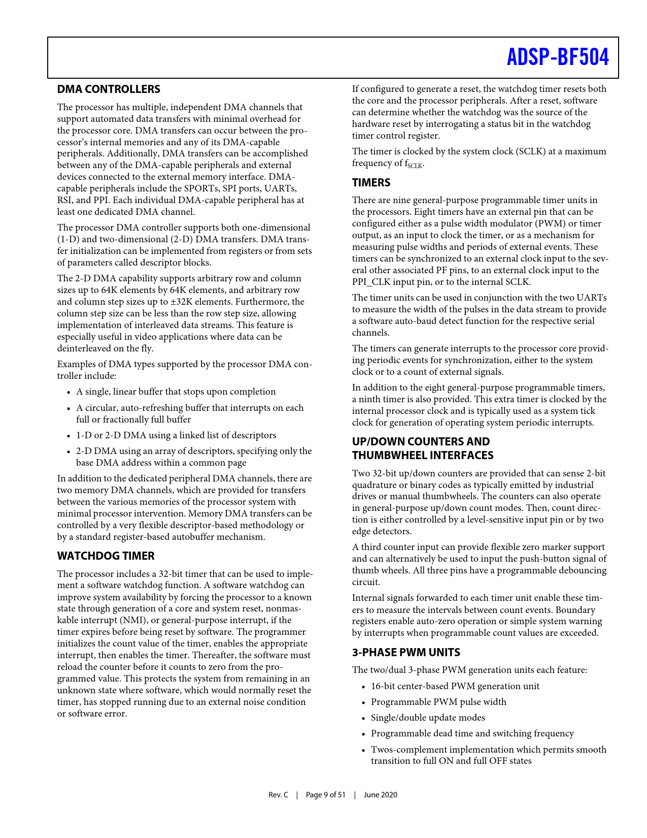 ADSP-BF504DMA CONTROLLERS If configured to generate a reset, the watchdog timer resets both the core and the processor peripherals. After a reset, software The processor has multiple, independent DMA channels that can determine whether the watchdog was the source of the support automated data transfers with minimal overhead for hardware reset by interrogating a status bit in the watchdog the processor core. DMA transfers can occur between the pro- timer control register. cessor’s internal memories and any of its DMA-capable peripherals. Additionally, DMA transfers can be accomplished The timer is clocked by the system clock (SCLK) at a maximum between any of the DMA-capable peripherals and external frequency of fSCLK. devices connected to the external memory interface. DMA- TIMERS capable peripherals include the SPORTs, SPI ports, UARTs, RSI, and PPI. Each individual DMA-capable peripheral has at There are nine general-purpose programmable timer units in least one dedicated DMA channel. the processors. Eight timers have an external pin that can be The processor DMA controller supports both one-dimensional configured either as a pulse width modulator (PWM) or timer (1-D) and two-dimensional (2-D) DMA transfers. DMA trans- output, as an input to clock the timer, or as a mechanism for fer initialization can be implemented from registers or from sets measuring pulse widths and periods of external events. These of parameters called descriptor blocks. timers can be synchronized to an external clock input to the sev- eral other associated PF pins, to an external clock input to the The 2-D DMA capability supports arbitrary row and column PPI_CLK input pin, or to the internal SCLK. sizes up to 64K elements by 64K elements, and arbitrary row and column step sizes up to ±32K elements. Furthermore, the The timer units can be used in conjunction with the two UARTs column step size can be less than the row step size, allowing to measure the width of the pulses in the data stream to provide implementation of interleaved data streams. This feature is a software auto-baud detect function for the respective serial especially useful in video applications where data can be channels. deinterleaved on the fly. The timers can generate interrupts to the processor core provid- Examples of DMA types supported by the processor DMA con- ing periodic events for synchronization, either to the system troller include: clock or to a count of external signals. • A single, linear buffer that stops upon completion In addition to the eight general-purpose programmable timers, a ninth timer is also provided. This extra timer is clocked by the • A circular, auto-refreshing buffer that interrupts on each internal processor clock and is typically used as a system tick full or fractionally full buffer clock for generation of operating system periodic interrupts. • 1-D or 2-D DMA using a linked list of descriptors UP/DOWN COUNTERS AND • 2-D DMA using an array o f descriptors, specifying only the THUMBWHEEL INTERFACES base DMA address within a common page Two 32-bit up/down counters are provided that can sense 2-bit In addition to the dedicated peripheral DMA channels, there are quadrature or binary codes as typically emitted by industrial two memory DMA channels, which are provided for transfers drives or manual thumbwheels. The counters can also operate between the various memories of the processor system with in general-purpose up/down count modes. Then, count direc- minimal processor intervention. Memory DMA transfers can be tion is either controlled by a level-sensitive input pin or by two controlled by a very flexible descriptor-based methodology or edge detectors. by a standard register-based autobuffer mechanism. A third counter input can provide flexible zero marker support WATCHDOG TIMER and can alternatively be used to input the push-button signal of The processor includes a 32-bit timer that can be used to imple- thumb wheels. All three pins have a programmable debouncing ment a software watchdog function. A software watchdog can circuit. improve system availability by forcing the processor to a known Internal signals forwarded to each timer unit enable these tim- state through generation of a core and system reset, nonmas- ers to measure the intervals between count events. Boundary kable interrupt (NMI), or general-purpose interrupt, if the registers enable auto-zero operation or simple system warning timer expires before being reset by software. The programmer by interrupts when programmable count values are exceeded. initializes the count value of the timer, enables the appropriate interrupt, then enables the timer. Thereafter, the software must 3-PHASE PWM UNITS reload the counter before it counts to zero from the pro- The two/dual 3-phase PWM generation units each feature: grammed value. This protects the system from remaining in an unknown state where software, which would normally reset the • 16-bit center-based PWM generation unit timer, has stopped running due to an external noise condition • Programmable PWM pulse width or software error. • Single/double update modes • Programmable dead time and switching frequency • Twos-complemen t implementation which permits smooth transition to full ON and full OFF states Rev. C | Page 9 of 51 | June 2020 Document Outline Blackfin Embedded Processor Features Memory Peripherals Table of Contents Revision History General Description Portable Low-Power Architecture System Integration Processor Peripherals Blackfin Processor Core Memory Architecture Internal (Core-Accessible) Memory External (Interface-Accessible) Memory I/O Memory Space Booting Event Handling Core Event Controller (CEC) System Interrupt Controller (SIC) Event Control DMA Controllers Watchdog Timer Timers Up/Down Counters and Thumbwheel Interfaces 3-Phase PWM Units Serial Ports Serial Peripheral Interface (SPI) Ports UART Ports (UARTs) Parallel Peripheral Interface (PPI) General-Purpose 