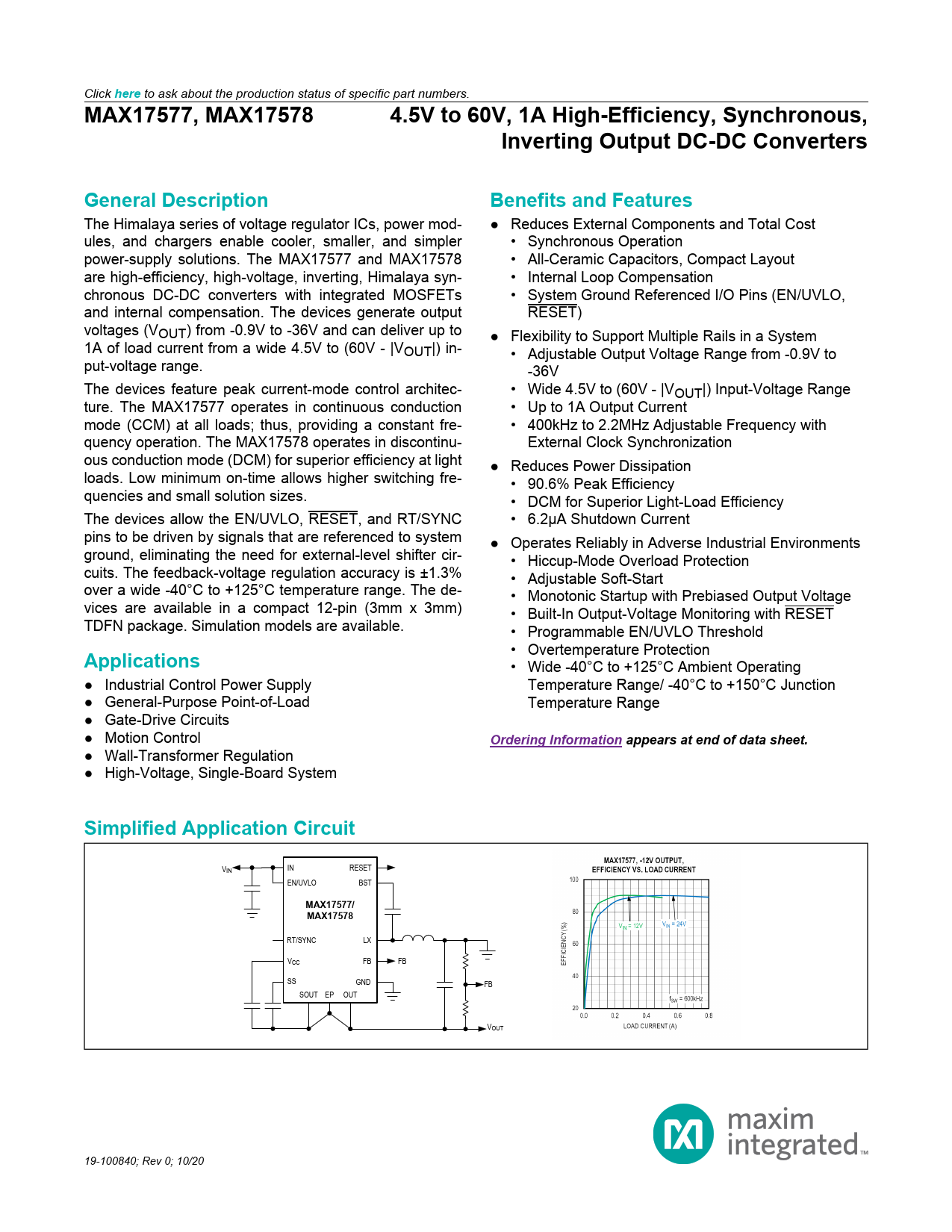 here. MAX17577, MAX17578. 4.5V to 60V, 1A High-Efficiency, Synchronous,. Inverting Output DC-DC Converters. General Description