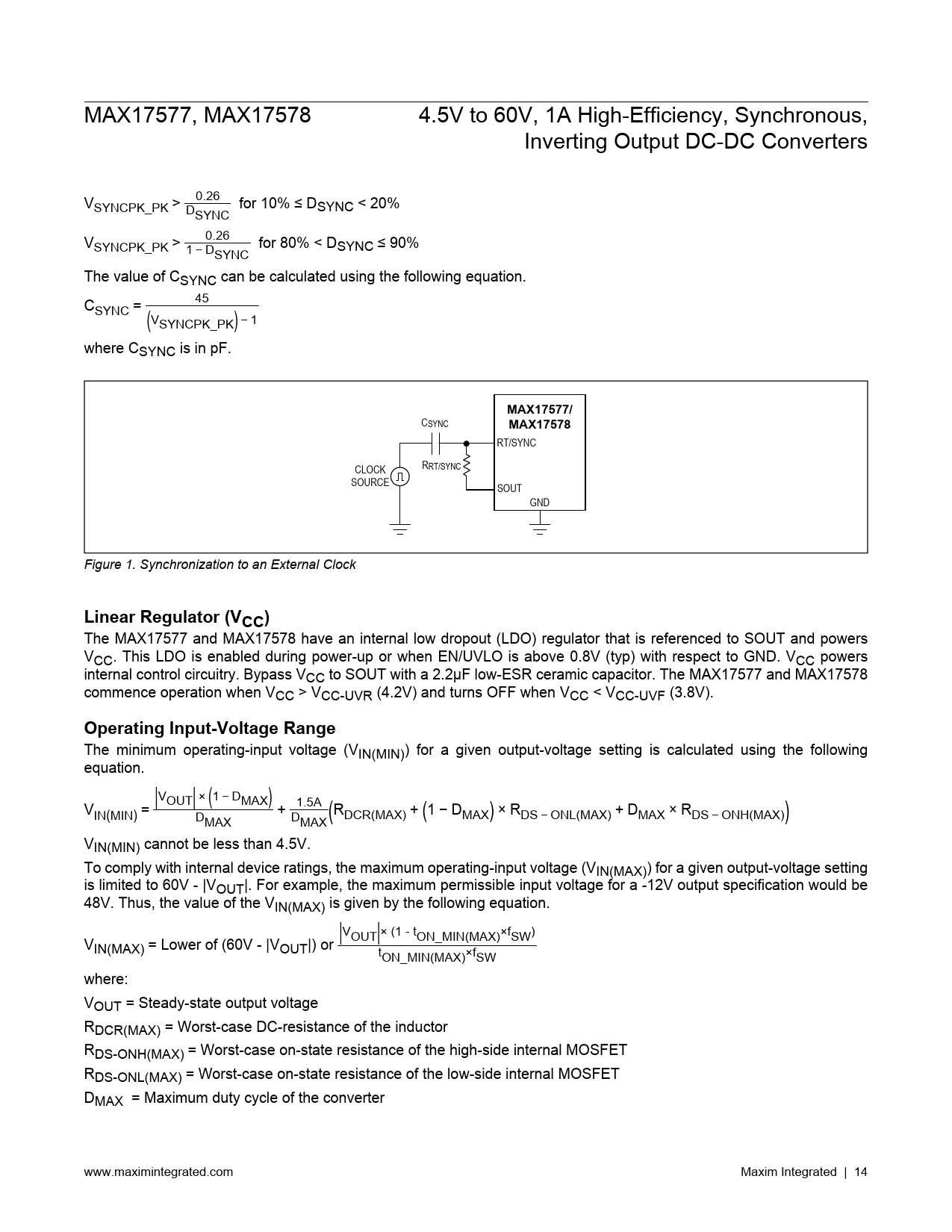 MAX17577, MAX17578 4.5V to 60V, 1A High-Efficiency, Synchronous, Inverting Output DC-DC Converters VSYNCPK_PK > 0.26 for 10% ≤ D D SYNC < 20% SYNC VSYNCPK_PK > 0.26 for 80% < D 1 − D SYNC ≤ 90% SYNC The value of CSYNC can be calculated using the following equation. CSYNC = 45 (VSYNCPK_PK)−1 where CSYNC is in pF. MAX17577/ CSYNC MAX17578 RT/SYNC RRT/SYNC CLOCK SOURCE SOUT GND Figure 1. Synchronization to an External Clock Linear Regulator (VCC) The MAX17577 and MAX17578 have an internal low dropout (LDO) regulator that is referenced to SOUT and powers VCC. This LDO is enabled during power-up or when EN/UVLO is above 0.8V (typ) with respect to GND. VCC powers internal control circuitry. Bypass VCC to SOUT with a 2.2μF low-ESR ceramic capacitor. The MAX17577 and MAX17578 commence operation when VCC > VCC-UVR (4.2V) and turns OFF when VCC < VCC-UVF (3.8V). Operating Input-Voltage Range The minimum operating-input voltage (VIN(MIN)) for a given output-voltage setting is calculated using the following equation. |VOUT|×(1−DMAX) VIN(MIN) = + 1.5A (R D DCR(MAX) + (1 − DMAX) × RDS − ONL(MAX) + DMAX × RDS − ONH(MAX)) MAX DMAX VIN(MIN) cannot be less than 4.5V. To comply with internal device ratings, the maximum operating-input voltage (VIN(MAX)) for a given output-voltage setting is limited to 60V - |VOUT|. For example, the maximum permissible input voltage for a -12V output specification would be 48V. Thus, the value of the VIN(MAX) is given by the following equation. |VOUT|× (1 - tON_MIN(MAX)×fSW) VIN(MAX) = Lower of (60V - |VOUT|) or tON_MIN(MAX)×fSW where: VOUT = Steady-state output voltage RDCR(MAX) = Worst-case DC-resistance of the inductor RDS-ONH(MAX) = Worst-case on-state resistance of the high-side internal MOSFET RDS-ONL(MAX) = Worst-case on-state resistance of the low-side internal MOSFET DMAX = Maximum duty cycle of the converter www.maximintegrated.com Maxim Integrated | 14 Document Outline General Description Applications Benefits and Features Simplified Application Circuit Absolute Maximum Ratings Package Information TDFN Electrical Characteristics Electrical Characteristics (continued) Typical Operating Characteristics Typical Operating Characteristics (continued) Pin Configuration MAX17577, MAX17578 Pin Description Pin Description (continued) Functional Diagrams MAX17577/MAX17578 Block Diagram Detailed Description Switching Frequency and External Clock Synchronization Linear Regulator (VCC) Operating Input-Voltage Range Overcurrent Protection (OCP)/Hiccup Mode RESET Output Prebiased Output Thermal-Shutdown Protection Applications Information Inductor Selection Load Current Capability (IOUT(MAX)) Input Capacitor Selection Output-Capacitor Selection Soft-Start Capacitor Selection Adjusting Output Voltage Setting the Input Undervoltage-Lockout Level Inductive Output Short-Circuit Protection Power Dissipation PCB Layout Guidelines Typical Application Circuits -5V Typical Application Circuits Typical Application Circuits (continued) -12V Typical Application Circuit Ordering Information Revision History