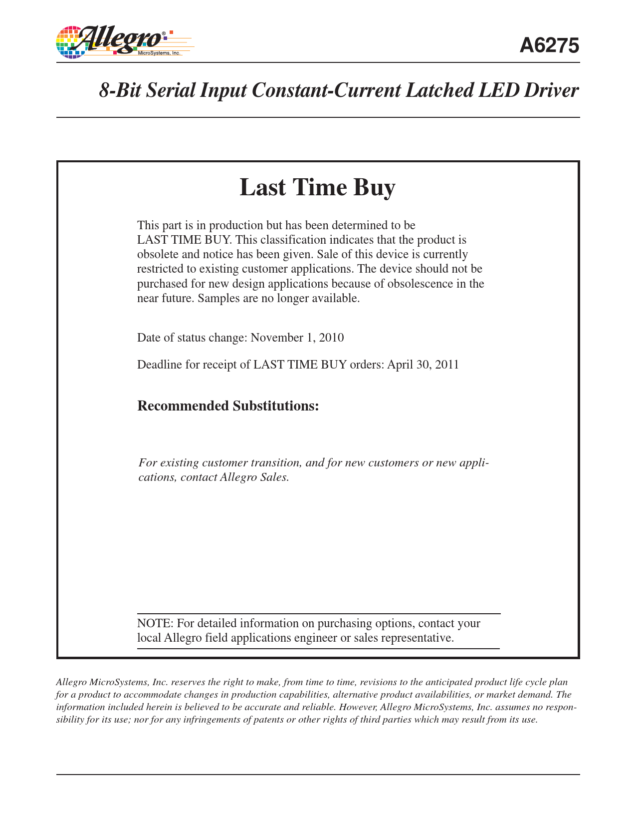A62758-Bit Serial Input Constant-Current Latched LED DriverLast Time Buy This part is in production but has been determined to be LAST TIME BUY. This classification indicates that the product is obsolete and notice has been given. Sale of this device is currently restricted to existing customer applications. The device should not be purchased for new design applications because of obsolescence in the near future. Samples are no longer available. Date of status change: November 1, 2010 Deadline for receipt of LAST TIME BUY orders: April 30, 2011 Recommended Substitutions: For existing customer transition, and for new customers or new appli- cations, contact Allegro Sales. NOTE: For detailed information on purchasing options, contact your local Allegro field applications engineer or sales representative. Allegro MicroSystems, Inc. reserves the right to make, from time to time, revisions to the anticipated product life cycle plan for a product to accommodate changes in production capabilities, alternative product availabilities, or market demand. The information included herein is believed to be accurate and reliable. However, Allegro MicroSystems, Inc. assumes no respon- sibility for its use; nor for any infringements of patents or other rights of third parties which may result from its use.