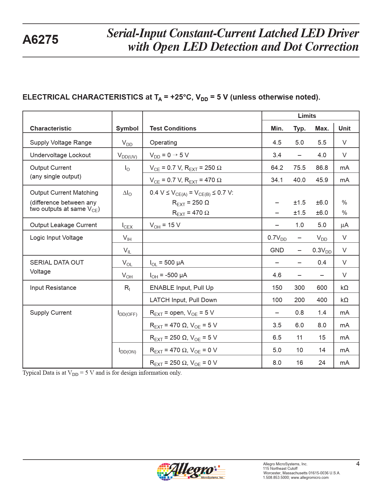 Serial-Input Constant-Current Latched LED Driver A6275 with Open LED Detection and Dot Correction ELECTRICAL CHARACTERISTICS at TA = +25°C, VDD = 5 V (unless otherwise noted). Limits Characteristic Symbol Test Conditions Min. Typ. Max. Unit