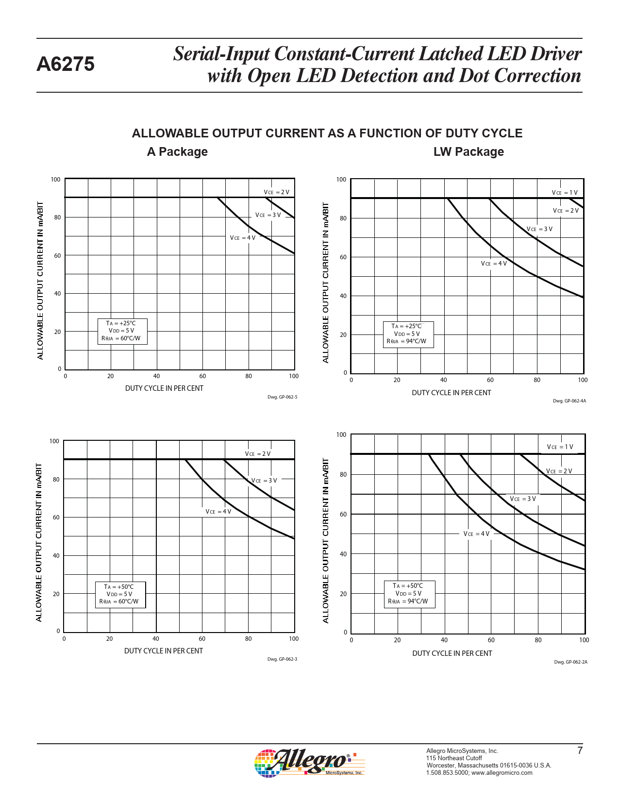100 100 V CE = 2 V V CE = 1 V V CE = 2 V V CE = 3 V 80 80 V CE = 3 V V CE = 4 V 60 60 V CE = 4 V 40 40 TA = +25°C TA = +25°C 20 V DD = 5 V 20 V DD = 5 V R θJA = 60°C/W R θJA = 94°C/W 0 0 0 20 40 60 80 100 0 20 40 60 80 100 DUTY CYCLE IN PER CENT DUTY CYCLE IN PER CENT Dwg. GP-062-5 Dwg. GP-062-4A 100 100 V CE = 1 V V CE = 2 V V CE = 2 V 80 80 V CE = 3 V V CE = 3 V V CE = 4 V 60 60 V CE = 4 V 40 40 TA = +50°C TA = +50°C 20 V DD = 5 V 20 V DD = 5 V R θJA = 60°C/W R θJA = 94°C/W 0 0 0 20 40 60 80 100 0 20 40 60 80 100 DUTY CYCLE IN PER CENT DUTY CYCLE IN PER CENT Dwg. GP-062-3 Dwg. GP-062-2A Allegro MicroSystems, Inc. 7 115 Northeast Cutoff Worcester, Massachusetts 01615-0036 U.S.A. 1.508.853.5000; www.allegromicro.com