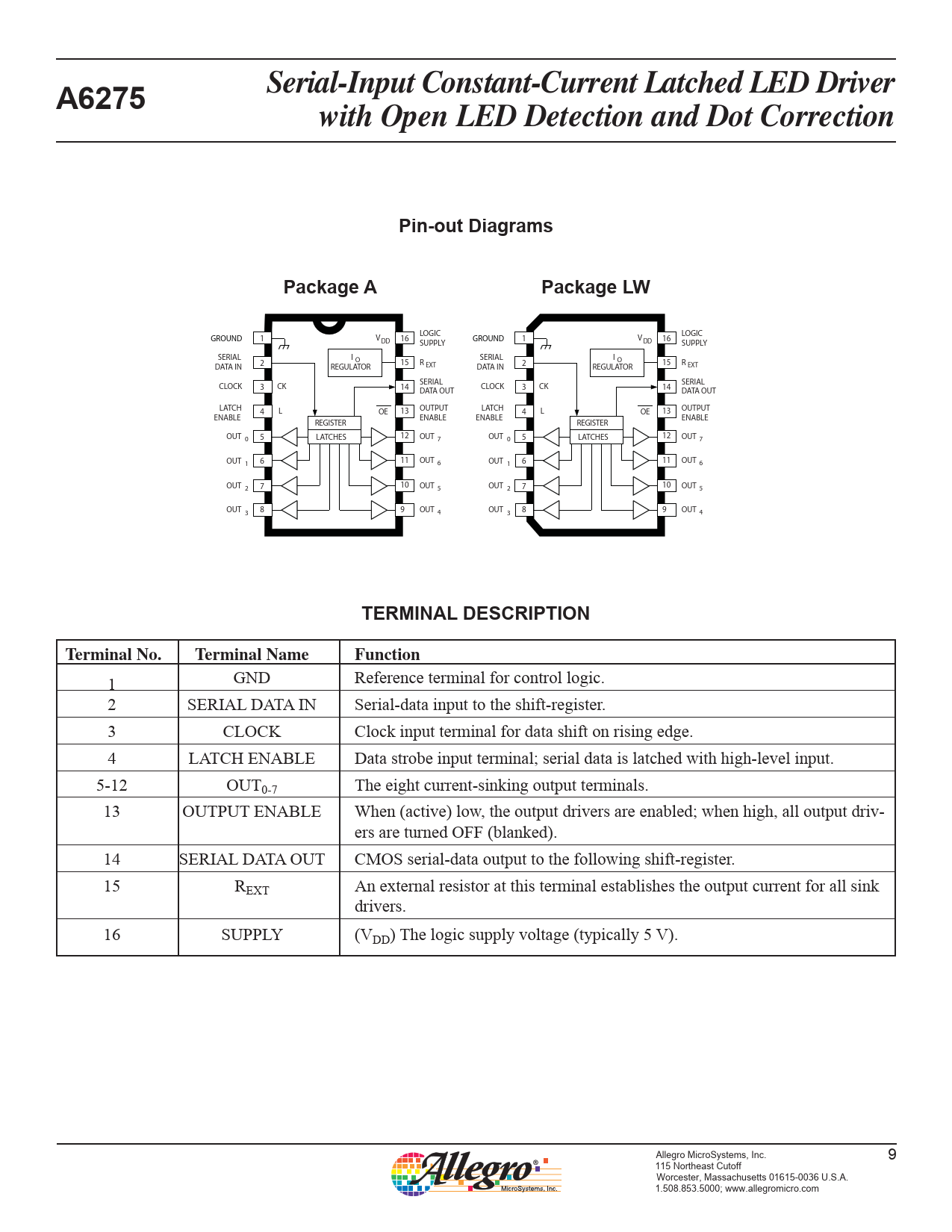 1 GND Reference terminal for control logic. 2 SERIAL DATA IN Serial-data input to the shift-register. 3 CLOCK Clock input terminal for data shift on rising edge. 4 LATCH ENABLE Data strobe input terminal; serial data is latched with high-level input. 5-12 OUT0-7 The eight current-sinking output ter mi nals. 13 OUTPUT ENABLE When (active) low, the output drivers are enabled; when high, all output driv- ers are turned OFF (blanked). 14 SERIAL DATA OUT CMOS serial-data output to the following shift-register. 15 REXT An external resistor at this terminal establishes the output current for all sink drivers. 16 SUPPLY (VDD) The logic supply voltage (typically 5 V). Allegro MicroSystems, Inc. 9 115 Northeast Cutoff Worcester, Massachusetts 01615-0036 U.S.A. 1.508.853.5000; www.allegromicro.com