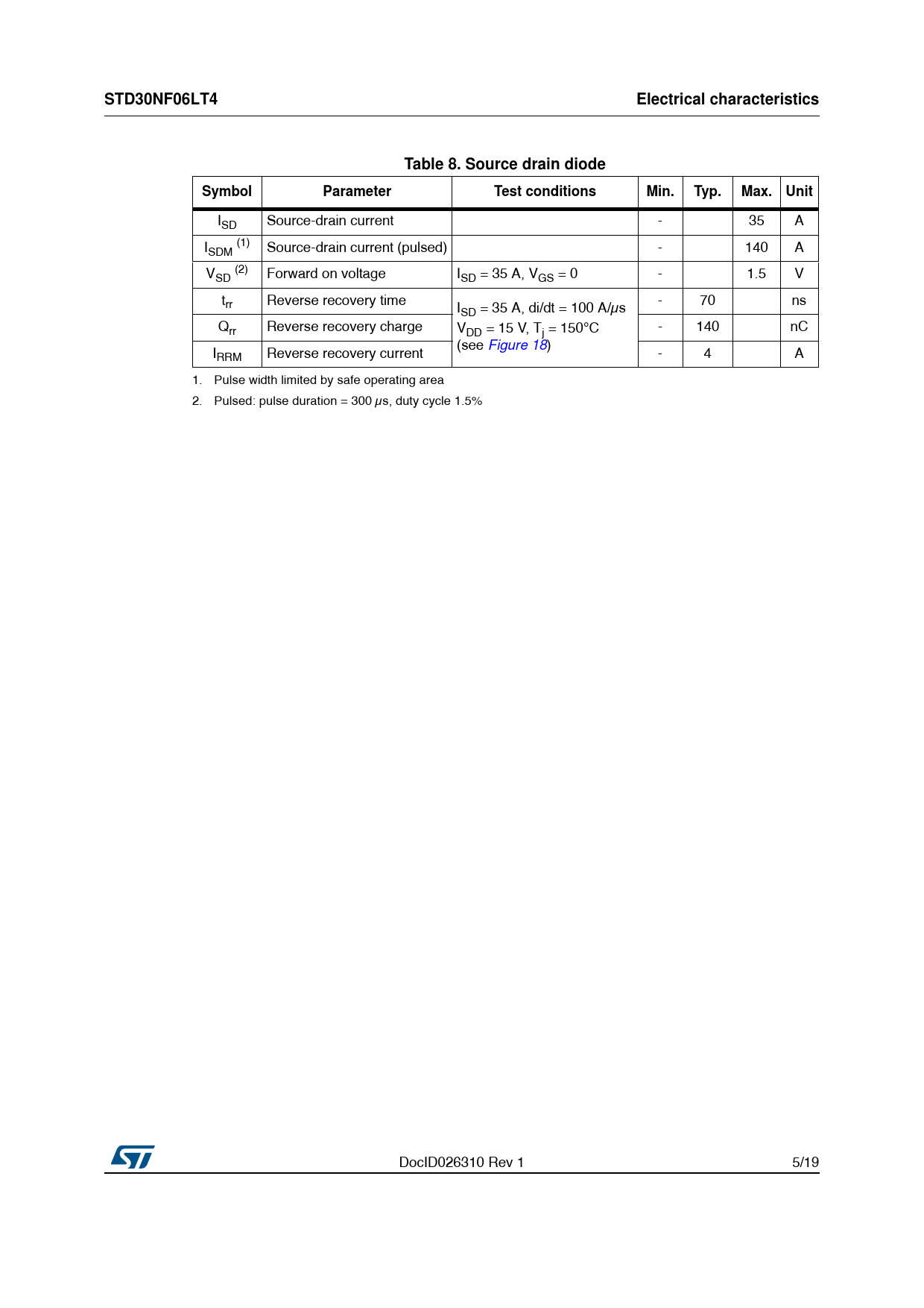link to page 8 STD30NF06LT4Electrical characteristicsTable 8. Source drain diodeSymbolParameterTest conditionsMin.Typ.Max.Unit I Source-drain current - 35 A SD (1) I Source-drain current (pulsed) - 140 A SDM (2) V Forward on voltage I = 35 A, V = 0 - 1.5 V SD SD GS t Reverse recovery time - 70 ns rr I = 35 A, di/dt = 100 A/μs SD Q Reverse recovery charge V = 15 V, T = 150°C - 140 nC rr DD j (see Figure 18) I Reverse recovery current - 4 A RRM 1. Pulse width limited by safe operating area 2. Pulsed: pulse duration = 300 μs, duty cycle 1.5% DocID026310 Rev 1 5/19 19 Document Outline Figure 1. Internal schematic diagram Table 1. Device summary 1 Electrical ratings Table 2. Absolute maximum ratings Table 3. Thermal data Table 4. Avalanche characteristics 2 Electrical characteristics Table 5. On /off states Table 6. Dynamic Table 7. Switching times Table 8. Source drain diode 2.1 Electrical characteristics (curves) Figure 2. Safe operating area Figure 3. Thermal impedance Figure 4. Output characteristics Figure 5. Transfer characteristics Figure 6. Gate charge vs gate-source voltage Figure 7. Static drain-source on-resistance Figure 8. Capacitance variations Figure 9. Normalized gate threshold voltage vs temperature Figure 10. Normalized on-resistance vs temperature Figure 11. Normalized V(BR)DSS vs temperature Figure 12. Source-drain diode forward characteristics 3 Test circuits Figure 13. Switching times test circuit for resistive load Figure 14. Gate charge test circuit Figure 15. Test circuit for inductive load switching and diode recovery times Figure 16. Unclamped inductive load test circuit Figure 17. Unclamped inductive waveform Figure 18. Switching time waveform 4 Package mechanical data Figure 19. DPAK (TO-252) type A drawing Table 9. DPAK (TO-252) type A mechanical data Figure 20. DPAK (TO-252) type A footprint Figure 21. DPAK (TO-252) type C drawing Table 10. DPAK (TO-252) type C mechanical data Figure 22. DPAK (TO-252) type A footprint 5 Packaging mechanical data Figure 23. Tape for DPAK (TO-252) Figure 24. Reel for DPAK (TO-252) Table 11. DPAK (TO-252) tape and reel mechanical data 6 Revision history Table 12. Document revision history