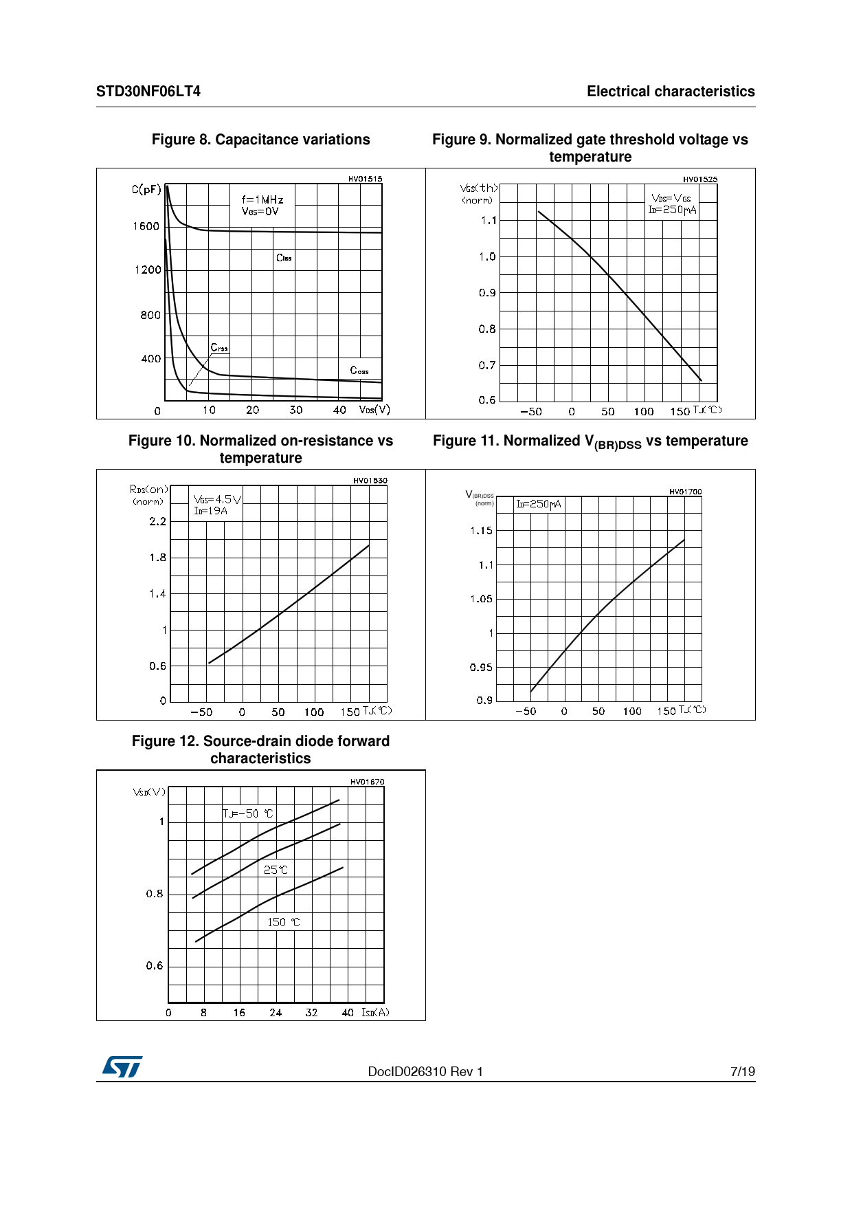 STD30NF06LT4 Electrical characteristics Figure 8. Capacitance variations Figure 9. Normalized gate threshold voltage vs temperature Figure 10. Normalized on-resistance vs Figure 11. Normalized V(BR)DSS vs temperature temperature