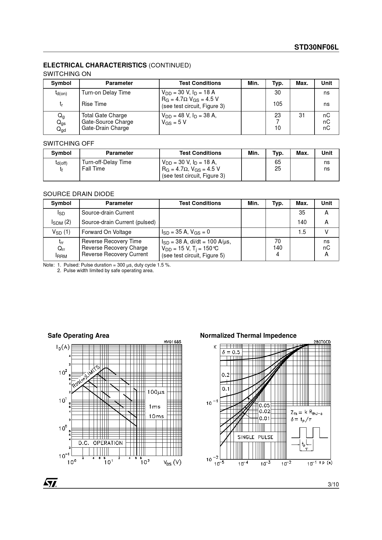 STD30NF06L. ELECTRICAL CHARACTERISTICS. Symbol. Parameter. Test Conditions. Min. Typ. Max. Unit. Safe Operating Area