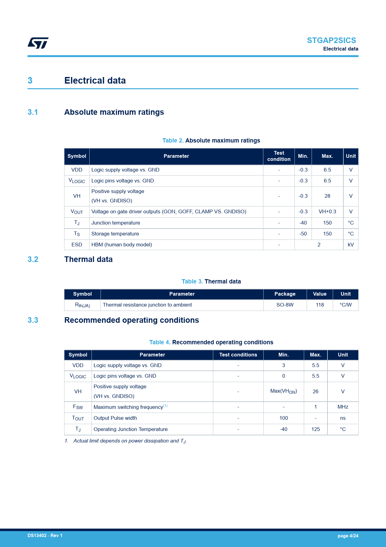 STGAP2SICS. Electrical data. 3.1. Absolute maximum ratings. Table 2. Absolute maximum ratings. Test. Symbol. Parameter. Min. Max. Unit