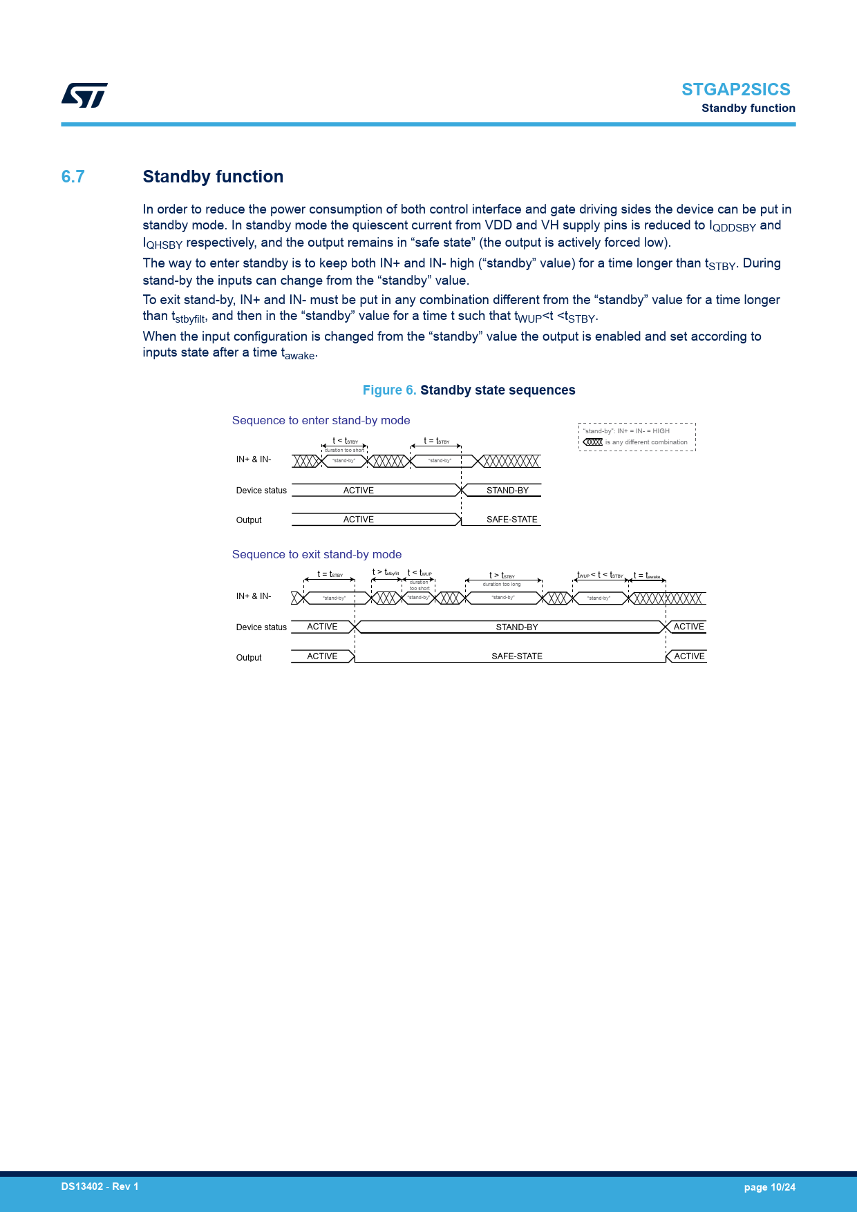 STGAP2SICSStandby function6.7Standby function In order to reduce the power consumption of both control interface and gate driving sides the device can be put in standby mode. In standby mode the quiescent current from VDD and VH supply pins is reduced to IQDDSBY and IQHSBY respectively, and the output remains in “safe state” (the output is actively forced low). The way to enter standby is to keep both IN+ and IN- high (“standby” value) for a time longer than tSTBY. During stand-by the inputs can change from the “standby” value. To exit stand-by, IN+ and IN- must be put in any combination different from the “standby” value for a time longer than tstbyfilt, and then in the “standby” value for a time t such that tWUP<t <tSTBY. When the input configuration is changed from the “standby” value the output is enabled and set according to inputs state after a time tawake. Figure 6. Standby state sequences Sequence to enter stand-by mode “stand-by”: IN+ = IN- = HIGH t < tSTBY t = tSTBY is any different combination duration too short IN+ & IN- “stand-by” “stand-by” Device status ACTIVE STAND-BY Output ACTIVE SAFE-STATE Sequence to exit stand-by mode t = t t > tstbyfilt t < t STBY WUP t > tSTBY tWUP < t < tSTBY t = tawake duration duration too long too short IN+ & IN- “stand-by” “stand-by” “stand-by” “stand-by” Device status ACTIVE STAND-BY ACTIVE Output ACTIVE SAFE-STATE ACTIVE DS13402 - Rev 1page 10/24 Document Outline Cover image Product status link / summary Features Application Description 1 Block diagram 2 Pin description and connection diagram 3 Electrical data 3.1 Absolute maximum ratings 3.2 Thermal data 3.3 Recommended operating conditions 4 Electrical characteristics 5 Isolation 6 Functional description 6.1 Gate driving power supply and UVLO 6.2 Power-up, power-down and “safe state” 6.3 Control inputs 6.4 Miller Clamp function 6.5 Watchdog 6.6 Thermal shutdown protection 6.7 Standby function 7 Typical application diagram 8 Layout 8.1 Layout guidelines and considerations 8.2 Layout example 9 Testing and characterization information 10 Package information 10.1 SO-8W package information 10.2 SO-8W suggested land pattern 11 Ordering information Revision history Contents List of tables List of figures