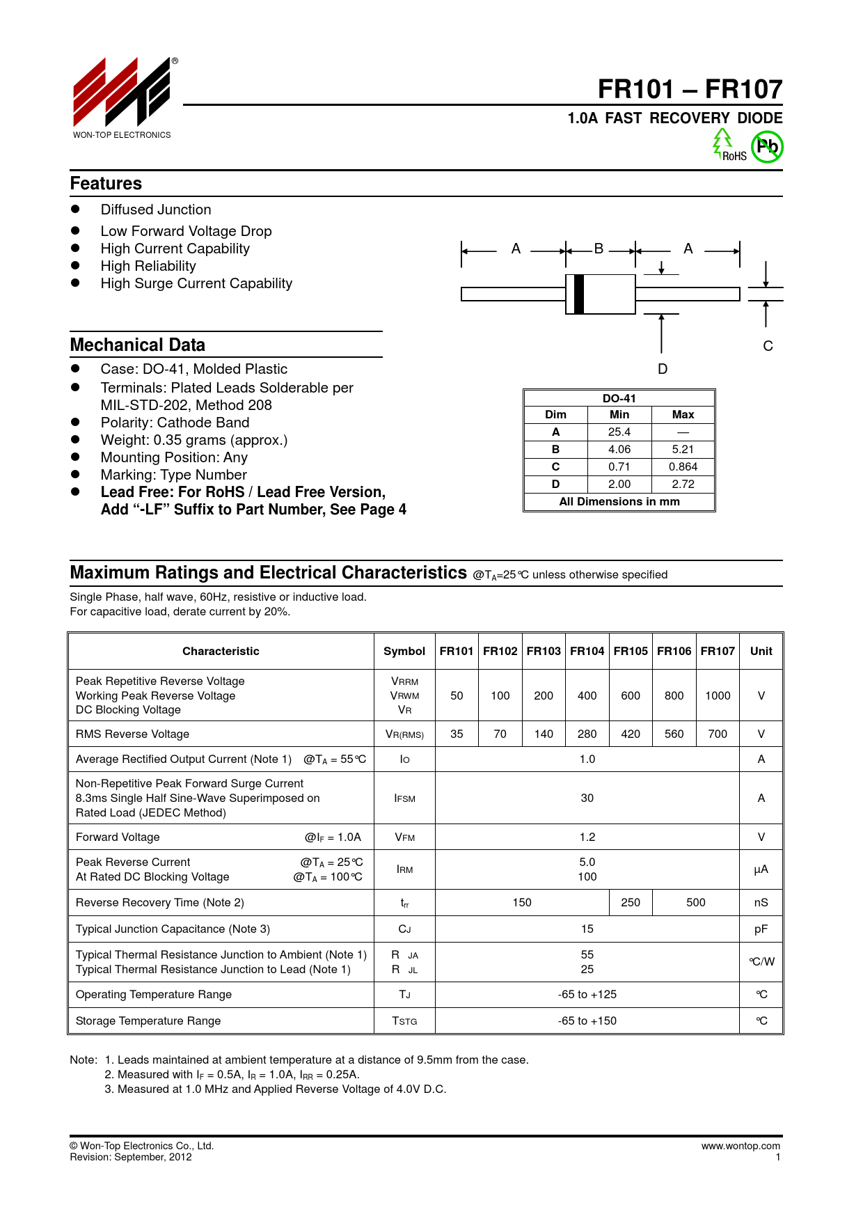 Datasheet FR101, FR102, FR103, FR104, FR105, FR106, FR107 (Won-Top Electronics)