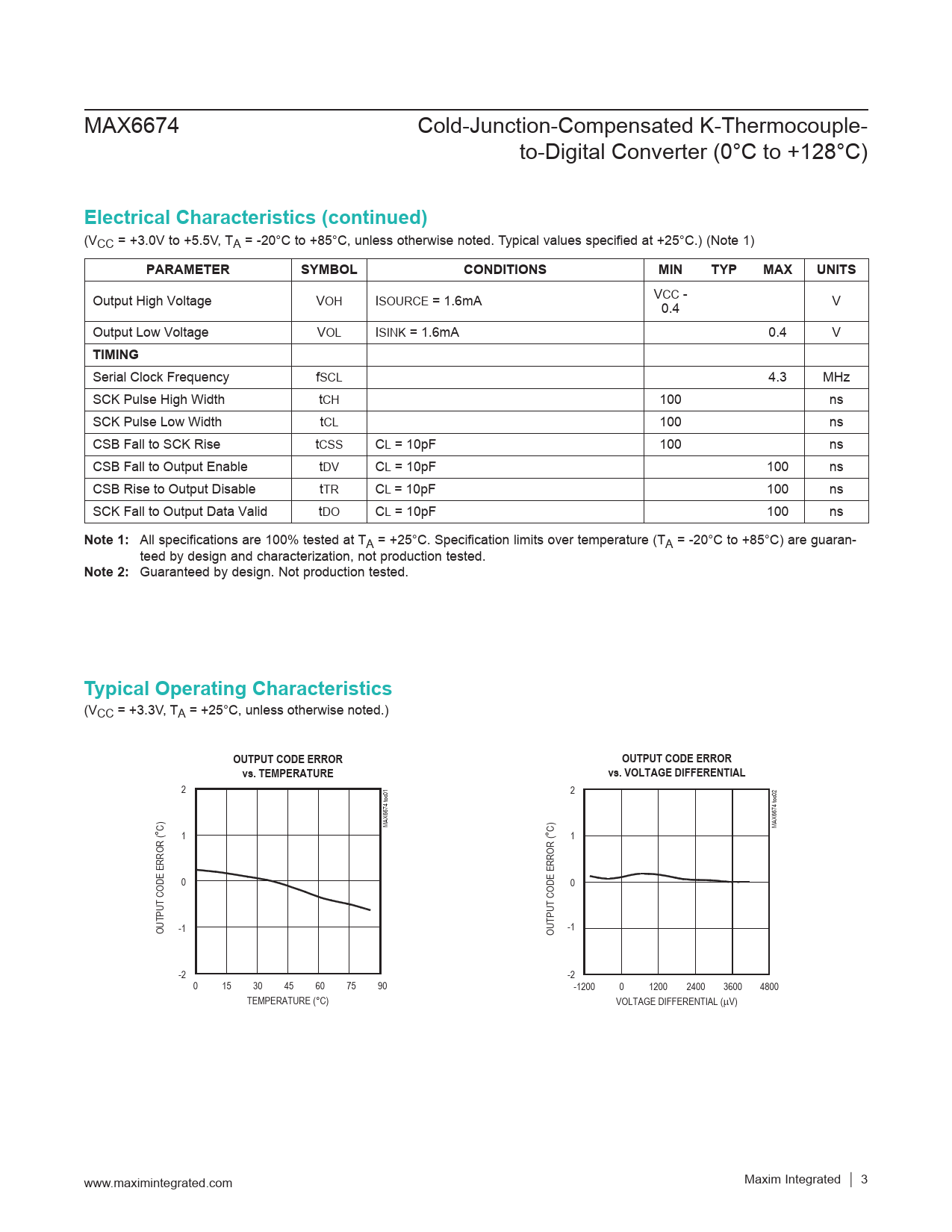 2 2 MAX6674 toc01 MAX6674 toc02 °C) °C) 1 1 0 0 OUTPUT CODE ERROR ( -1 -1 OUTPUT CODE ERROR ( -2 -2 0 15 30 45 60 75 90 -1200 0 1200 2400 3600 4800 TEMPERATURE (°C) VOLTAGE DIFFERENTIAL (µV) www.maximintegrated.com Maxim Integrated │ 3