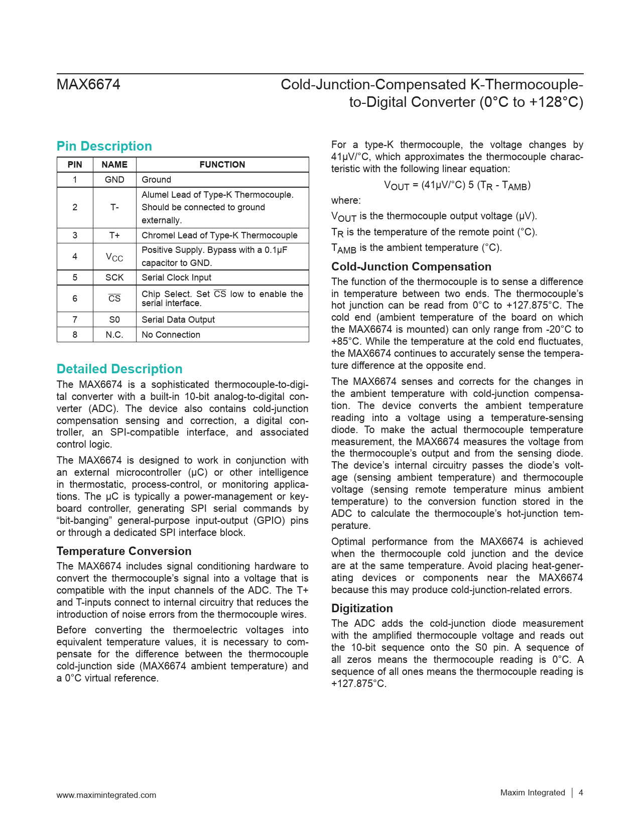 Pin Description. PIN. NAME. FUNCTION. Cold-Junction Compensation. Detailed Description. Temperature Conversion. Digitization