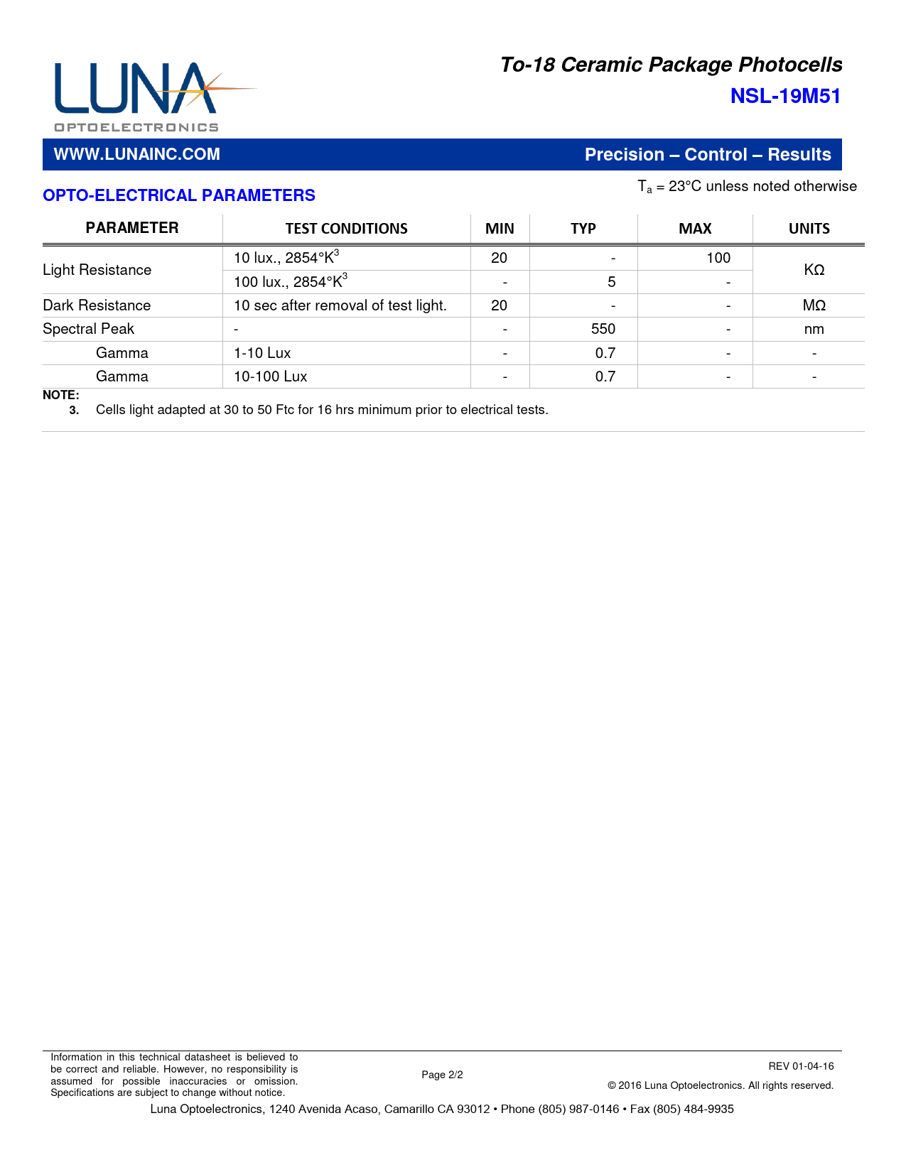 Cells light adapted at 30 to 50 Ftc for 16 hrs minimum prior to electrical tests. Information in this technical datasheet is believed to be correct and reliable. However, no responsibility is REV 01-04-16 Page 2/2 assumed for possible inaccuracies or omission. © 2016 Luna Optoelectronics. All rights reserved. Specifications are subject to change without notice. Luna Optoelectronics, 1240 Avenida Acaso, Camarillo CA 93012 • Phone (805) 987-0146 • Fax (805) 484-9935