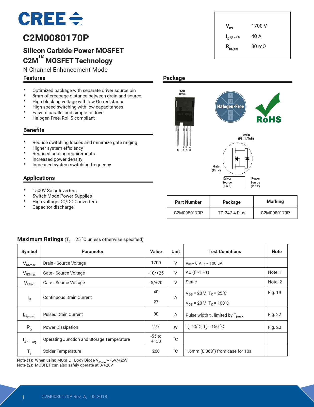 C2M0080170P. I D@ 25˚C. Silicon Carbide Power MOSFET. DS(on). C2MTM MOSFET Technology. Features. Package. TAB. Drain. Benefits
