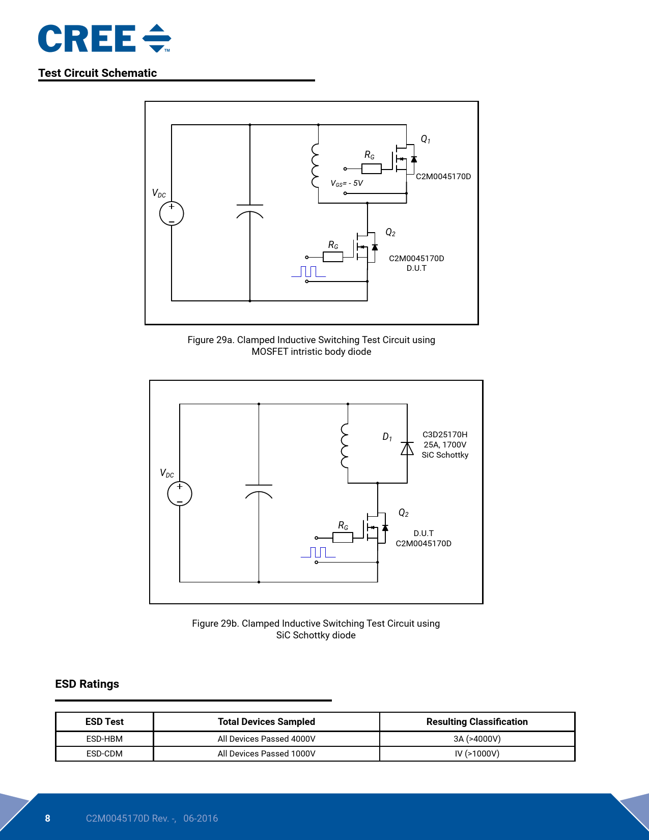 Q1 RG C2M0045170D VGS= - 5V VDC Q2 RG C2M0045170D D.U.T Figure 29a. Clamped Inductive Switching Test Circuit using MOSFET intristic body diode D C3D25170H 1 25A, 1700V SiC Schottky VDC Q2 RG D.U.T C2M0045170D Figure 29b. Clamped Inductive Switching Test Circuit using SiC Schottky diode