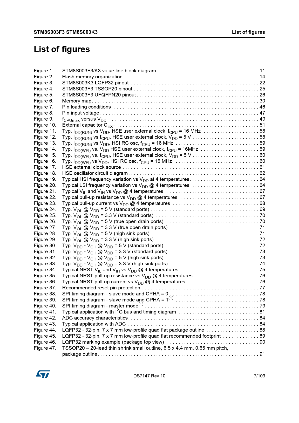 | Páginas / Página | 103 / 7 — STM8S003F3 STM8S003K3. List of figures |