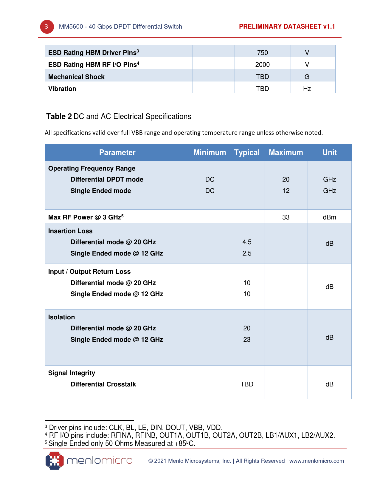 PRELIMINARY DATASHEET v1.1. ESD Rating HBM Driver Pins3. ESD Rating HBM RF I/O Pins4. Mechanical Shock. Vibration. Table 2
