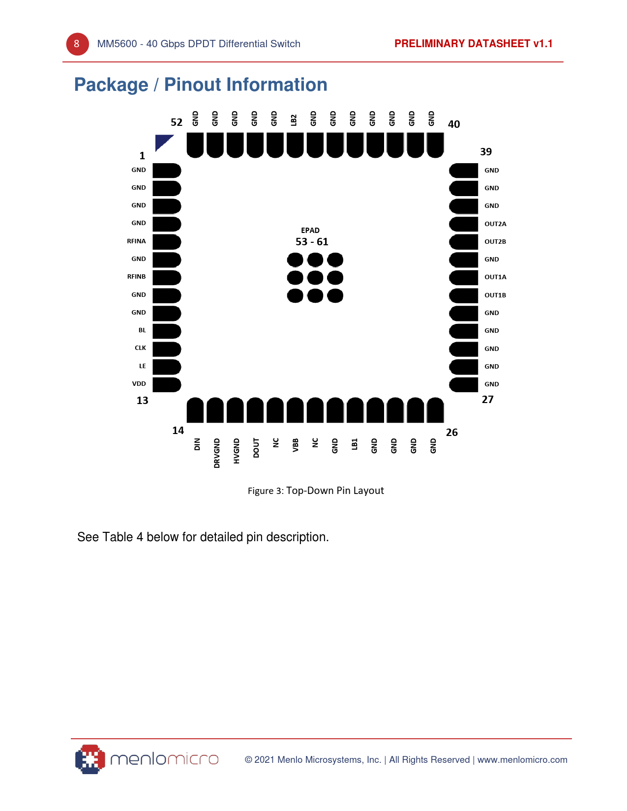 Figure 3: Top-Down Pin Layout See Table 4 below for detailed pin description. © 2021 Menlo Microsystems, Inc. | All Rights Reserved | www.menlomicro.com