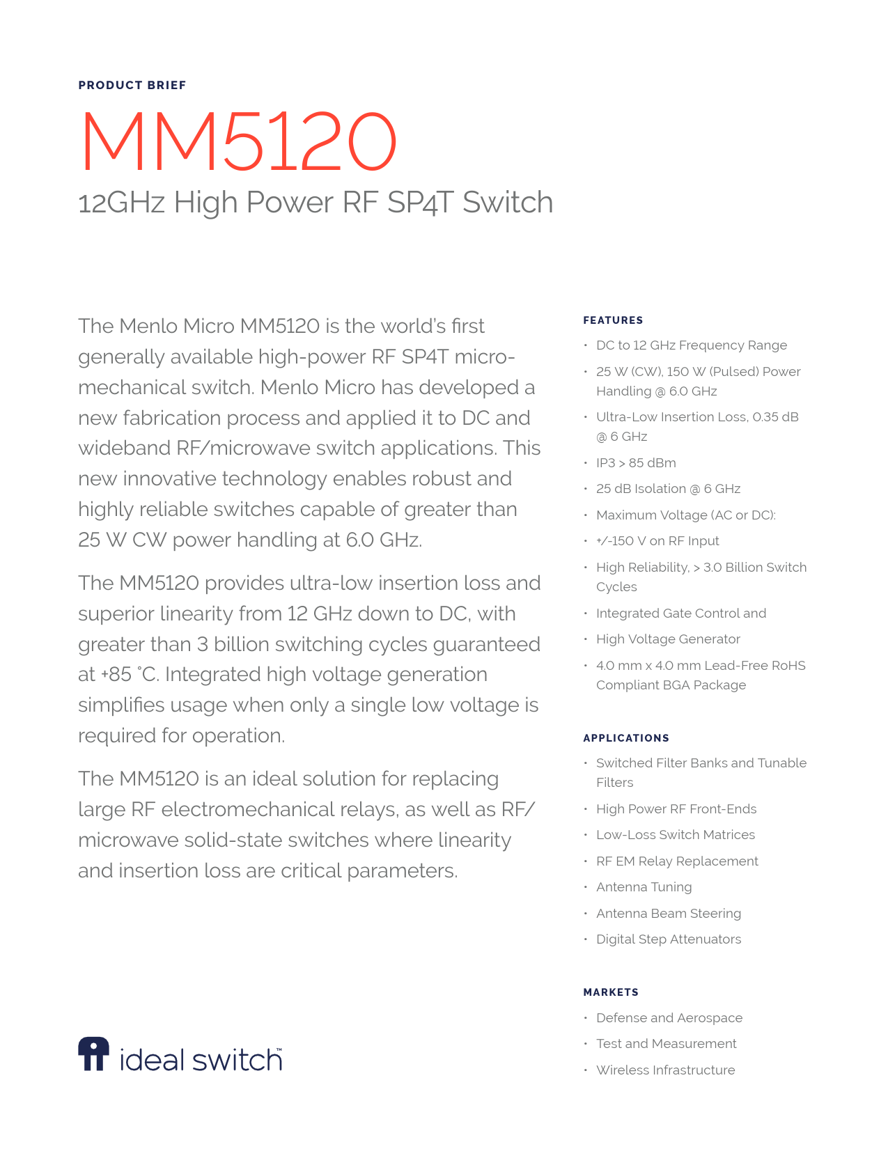 MM5120 12GHz High Power RF SP4T Switch The Menlo Micro MM5120 is the world’s first