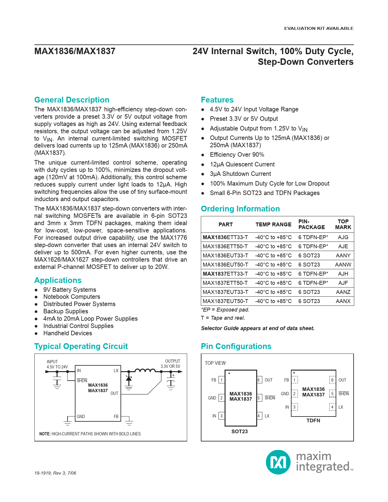 EVALUATION KIT AVAILABLE. MAX1836/MAX1837. 24V Internal Switch, 100% Duty Cycle,. Step-Down Converters. General Description
