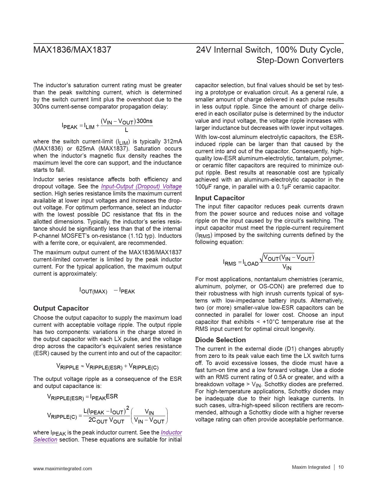 link to page 9 link to page 9 link to page 9 MAX1836/MAX1837 24V Internal Switch, 100% Duty Cycle, Step-Down Converters The inductor’s saturation current rating must be greater capacitor selection, but final values should be set by test- than the peak switching current, which is determined ing a prototype or evaluation circuit. As a general rule, a by the switch current limit plus the overshoot due to the smaller amount of charge delivered in each pulse results 300ns current-sense comparator propagation delay: in less output ripple. Since the amount of charge deliv- ered in each oscillator pulse is determined by the inductor ( IVN − VOUT)300ns value and input voltage, the voltage ripple increases with IPEAK = ILIM + L larger inductance but decreases with lower input voltages. With low-cost aluminum electrolytic capacitors, the ESR- where the switch current-limit (ILIM) is typically 312mA induced ripple can be larger than that caused by the (MAX1836) or 625mA (MAX1837). Saturation occurs current into and out of the capacitor. Consequently, high- when the inductor’s magnetic flux density reaches the quality low-ESR aluminum-electrolytic, tantalum, polymer, maximum level the core can support, and the inductance or ceramic filter capacitors are required to minimize out- starts to fall. put ripple. Best results at reasonable cost are typically Inductor series resistance affects both efficiency and achieved with an aluminum-electrolytic capacitor in the dropout voltage. See the Input-Output (Dropout) Voltage 100μF range, in parallel with a 0.1μF ceramic capacitor. section. High series resistance limits the maximum current available at lower input voltages and increases the drop- Input Capacitor out voltage. For optimum performance, select an inductor The input filter capacitor reduces peak currents drawn with the lowest possible DC resistance that fits in the from the power source and reduces noise and voltage allotted dimensions. Typically, the inductor’s series resis- ripple on the input caused by the circuit’s switching. The tance should be significantly less than that of the internal input capacitor must meet the ripple-current requirement P-channel MOSFET’s on-resistance (1.1Ω typ). Inductors (IRMS) imposed by the switching currents defined by the with a ferrite core, or equivalent, are recommended. following equation: The maximum output current of the MAX1836/MAX1837 current-limited converter is limited by the peak inductor VOUT( I V N − VOUT) I = I current. For the typical application, the maximum output RMS LOAD I V N current is approximately: For most applications, nontantalum chemistries (ceramic, I aluminum, polymer, or OS-CON) are preferred due to OUT(MAX) IPEAK their robustness with high inrush currents typical of sys- tems with low-impedance battery inputs. Alternatively, Output Capacitor two (or more) smaller-value low-ESR capacitors can be Choose the output capacitor to supply the maximum load connected in parallel for lower cost. Choose an input current with acceptable voltage ripple. The output ripple capacitor that exhibits < +10°C temperature rise at the has two components: variations in the charge stored in RMS input current for optimal circuit longevity. the output capacitor with each LX pulse, and the voltage Diode Selection drop across the capacitor’s equivalent series resistance The current in the external diode (D1) changes abruptly (ESR) caused by the current into and out of the capacitor: from zero to its peak value each time the LX switch turns off. To avoid excessive losses, the diode must have a R V IPPLE ≈ R V IPPLE(ESR) + R V IPPLE(C) fast turn-on time and a low forward voltage. Use a diode The output voltage ripple as a consequence of the ESR with an RMS current rating of 0.5A or greater, and with a and output capacitance is: breakdown voltage > VIN. Schottky diodes are preferred. For high-temperature applications, Schottky diodes may R V IPPLE(ESR) = IPEAKESR be inadequate due to their high leakage currents. In such cases, ultra-high-speed silicon rectifiers are recom- L(I − I )2 PEAK OUT I V N mended, although a Schottky diode with a higher reverse R V IPPLE(C) = 2COUT VOUT I V N − VOUT voltage rating can often provide acceptable performance. where IPEAK is the peak inductor current. See the Inductor Selection section. These equations are suitable for initial www.maximintegrated.com Maxim Integrated │ 10