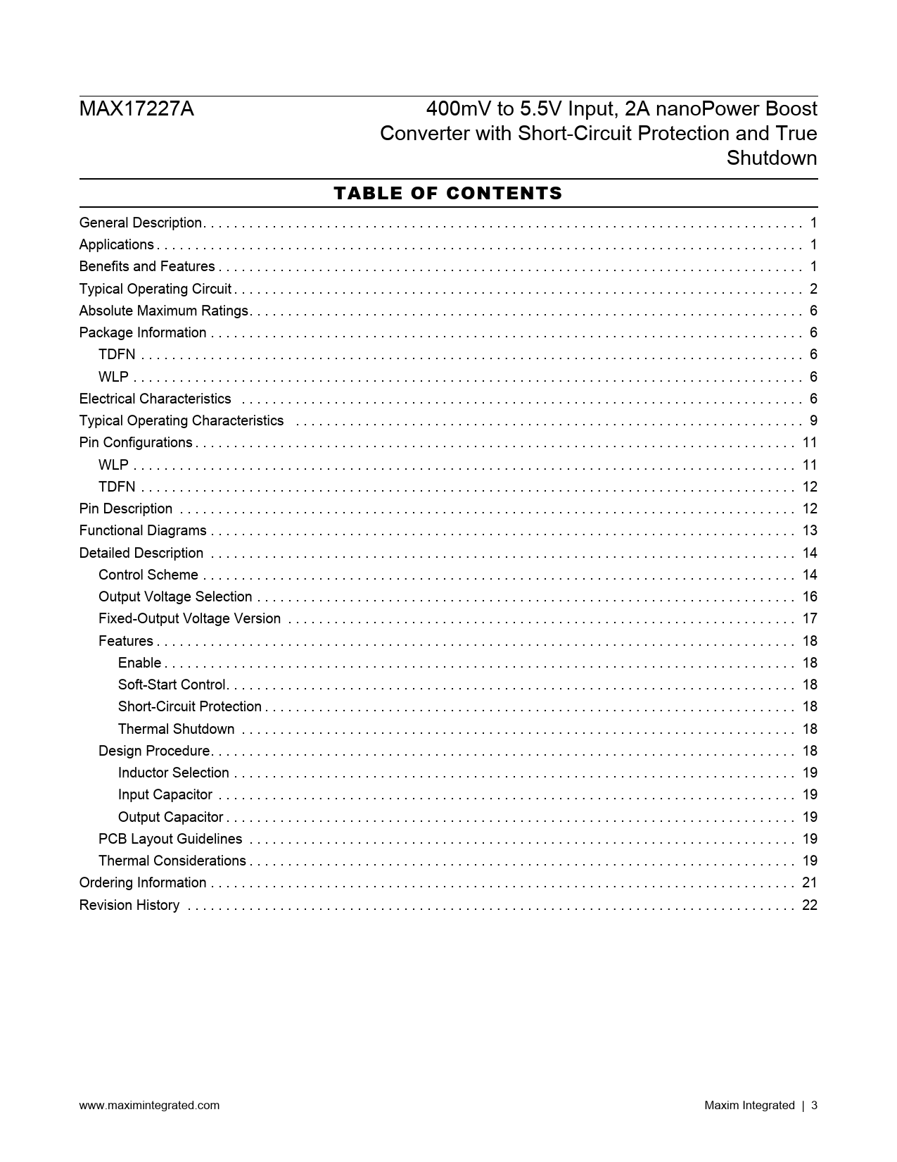link to page 1 link to page 1 link to page 1 link to page 2 link to page 6 link to page 6 link to page 6 link to page 6 link to page 6 link to page 9 link to page 11 link to page 11 link to page 12 link to page 12 link to page 13 link to page 14 link to page 14 link to page 16 link to page 17 link to page 18 link to page 18 link to page 18 link to page 18 link to page 18 link to page 18 link to page 19 link to page 19 link to page 19 link to page 19 link to page 19 link to page 21 link to page 22 MAX17227A 400mV to 5.5V Input, 2A nanoPower Boost Converter with Short-Circuit Protection and True Shutdown TABLE OF CONTENTS General Description. 1 Applications . 1 Benefits and Features . 1 Typical Operating Circuit . 2 Absolute Maximum Ratings. 6 Package Information . 6 TDFN . 6 WLP . 6 Electrical Characteristics . 6 Typical Operating Characteristics . 9 Pin Configurations . 11 WLP . 11 TDFN . 12 Pin Description . 12 Functional Diagrams . 13 Detailed Description . 14 Control Scheme . 14 Output Voltage Selection . 16 Fixed-Output Voltage Version . 17 Features . 18 Enable . 18 Soft-Start Control. 18 Short-Circuit Protection . 18 Thermal Shutdown . 18 Design Procedure. 18 Inductor Selection . 19 Input Capacitor . 19 Output Capacitor . 19 PCB Layout Guidelines . 19 Thermal Considerations . 19 Ordering Information . 21 Revision History . 22 www.maximintegrated.com Maxim Integrated | 3 Document Outline General Description Applications Benefits and Features Typical Operating Circuit Absolute Maximum Ratings Package Information TDFN WLP Electrical Characteristics Electrical Characteristics (continued) Typical Operating Characteristics Typical Operating Characteristics (continued) Pin Configurations WLP TDFN Pin Description Functional Diagrams Detailed Description Control Scheme Output Voltage Selection Fixed-Output Voltage Version Features Enable Soft-Start Control Short-Circuit Protection Thermal Shutdown Design Procedure Inductor Selection Input Capacitor Output Capacitor PCB Layout Guidelines Thermal Considerations Ordering Information Revision History