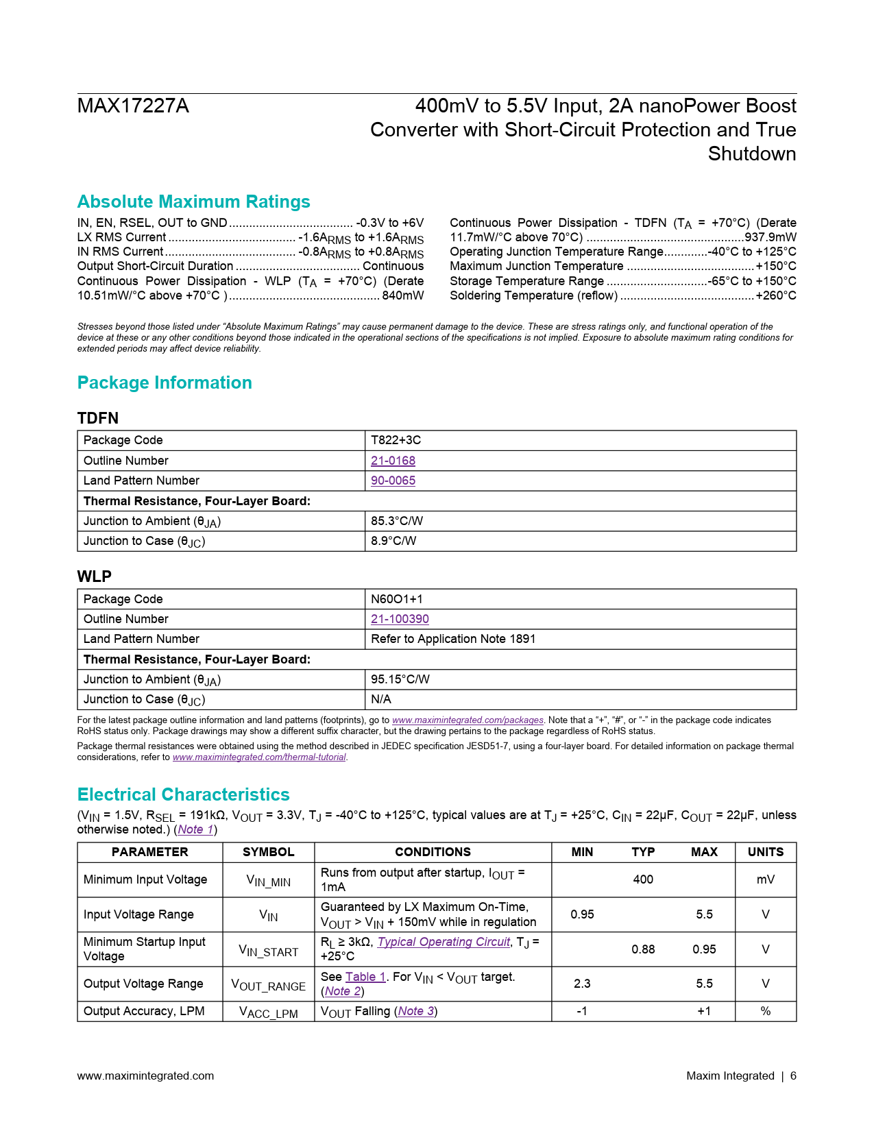link to page 8 link to page 2 link to page 17 link to page 8 link to page 8 MAX17227A 400mV to 5.5V Input, 2A nanoPower Boost Converter with Short-Circuit Protection and True Shutdown Absolute Maximum Ratings IN, EN, RSEL, OUT to GND ... -0.3V to +6V Continuous Power Dissipation - TDFN (TA = +70°C) (Derate LX RMS Current .. -1.6ARMS to +1.6ARMS 11.7mW/°C above 70°C) ...937.9mW IN RMS Current ... -0.8ARMS to +0.8ARMS Operating Junction Temperature Range...-40°C to +125°C Output Short-Circuit Duration ... Continuous Maximum Junction Temperature ..+150°C Continuous Power Dissipation - WLP (TA = +70°C) (Derate Storage Temperature Range ..-65°C to +150°C 10.51mW/°C above +70°C ) ... 840mW Soldering Temperature (reflow) ..+260°C Stresses beyond those listed under “Absolute Maximum Ratings” may cause permanent damage to the device. These are stress ratings only, and functional operation of the device at these or any other conditions beyond those indicated in the operational sections of the specifications is not implied. Exposure to absolute maximum rating conditions for extended periods may affect device reliability. Package InformationTDFN Package Code T822+3C Outline Number 21-0168 Land Pattern Number 90-0065 Thermal Resistance, Four-Layer Board: Junction to Ambient (θJA) 85.3°C/W Junction to Case (θJC) 8.9°C/W WLP Package Code N60O1+1 Outline Number 21-100390 Land Pattern Number Refer to Application Note 1891 Thermal Resistance, Four-Layer Board: Junction to Ambient (θJA) 95.15°C/W Junction to Case (θJC) N/A For the latest package outline information and land patterns (footprints), go to www.maximintegrated.com/packages. Note that a “+”, “#”, or “-” in the package code indicates RoHS status only. Package drawings may show a different suffix character, but the drawing pertains to the package regardless of RoHS status. Package thermal resistances were obtained using the method described in JEDEC specification JESD51-7, using a four-layer board. For detailed information on package thermal considerations, refer to www.maximintegrated.com/thermal-tutorial. Electrical Characteristics (VIN = 1.5V, RSEL = 191kΩ, VOUT = 3.3V, TJ = -40°C to +125°C, typical values are at TJ = +25°C, CIN = 22μF, COUT = 22μF, unless otherwise noted.) (Note 1) PARAMETERSYMBOLCONDITIONSMINTYPMAXUNITS Runs from output after startup, I Minimum Input Voltage V OUT = IN_MIN 400 mV 1mA Guaranteed by LX Maximum On-Time, Input Voltage Range VIN 0.95 5.5 V VOUT > VIN + 150mV while in regulation Minimum Startup Input R V L ≥ 3kΩ, Typical Operating Circuit, TJ = 0.88 0.95 V Voltage IN_START +25°C See Table 1. For V Output Voltage Range V IN < VOUT target. OUT_RANGE 2.3 5.5 V (Note 2) Output Accuracy, LPM VACC_LPM VOUT Falling (Note 3) -1 +1 % www.maximintegrated.com Maxim Integrated | 6 Document Outline General Description Applications Benefits and Features Typical Operating Circuit Absolute Maximum Ratings Package Information TDFN WLP Electrical Characteristics Electrical Characteristics (continued) Typical Operating Characteristics Typical Operating Characteristics (continued) Pin Configurations WLP TDFN Pin Description Functional Diagrams Detailed Description Control Scheme Output Voltage Selection Fixed-Output Voltage Version Features Enable Soft-Start Control Short-Circuit Protection Thermal Shutdown Design Procedure Inductor Selection Input Capacitor Output Capacitor PCB Layout Guidelines Thermal Considerations Ordering Information Revision History
